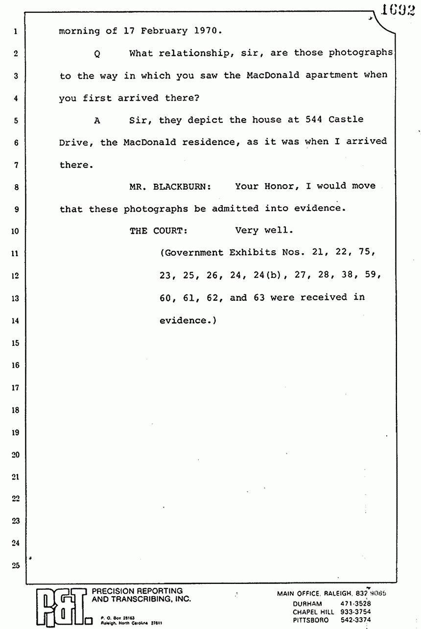 Q Now, tell us how many other military policemen besides that one were standing outside either on the sidewalk, the grass, or in the covered area that is shown at the door to Dr. MacDonald's house and the adjoining house?