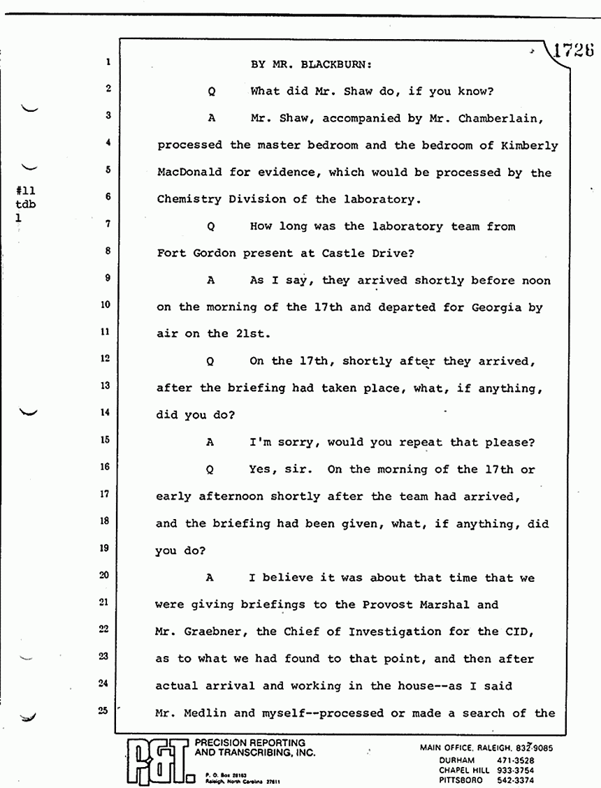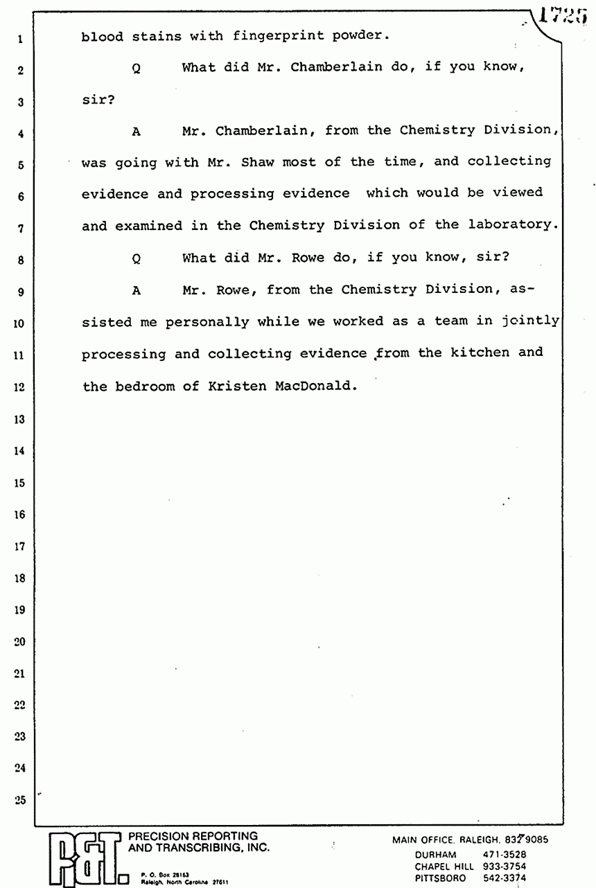 A He -- I asked him to take charge of the sketching and the searching for and collection of any fragile evidence within the north bedroom or the bedroom of Kristen MacDonald. He also made other cursory observations of the entire house.