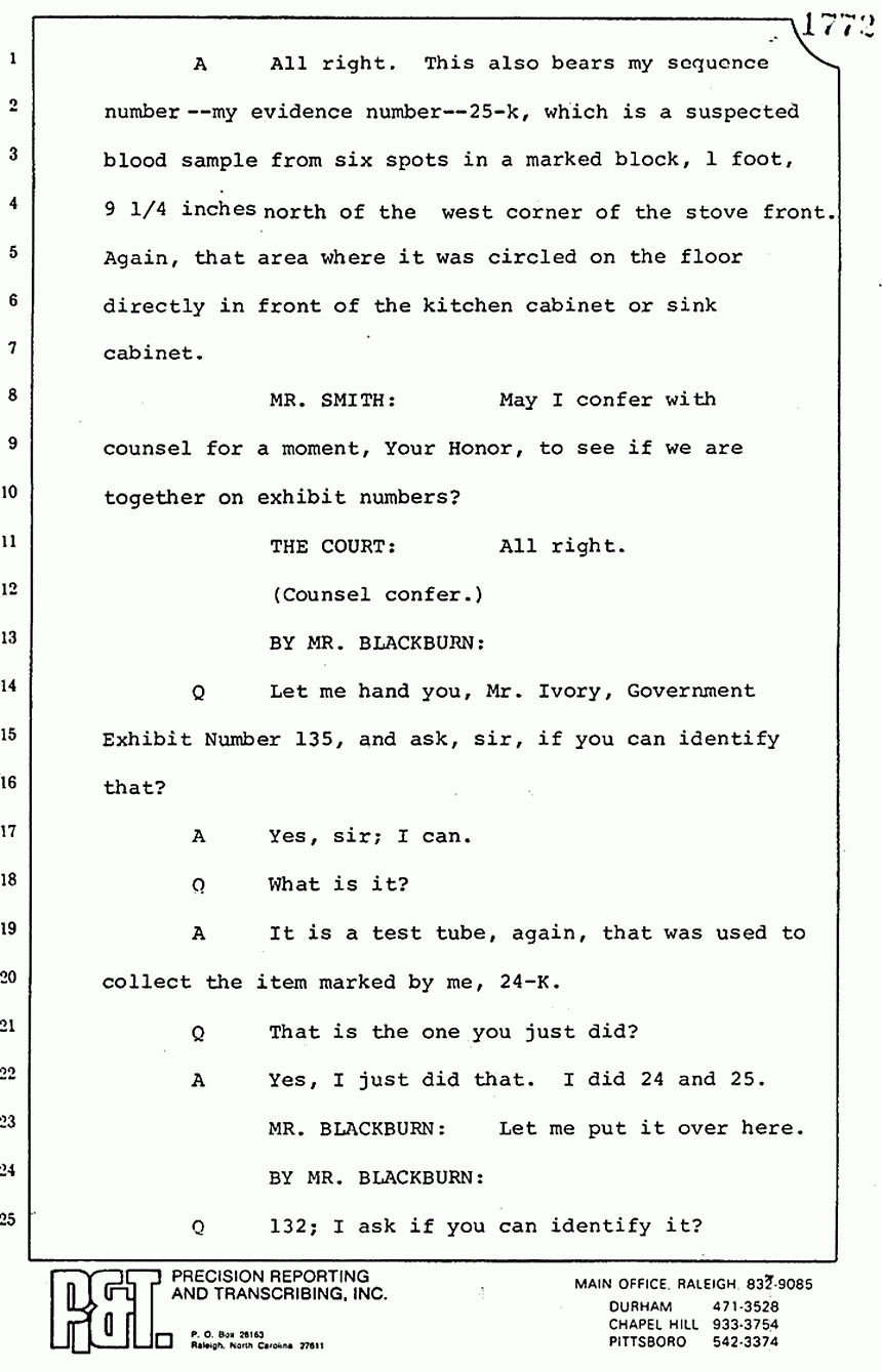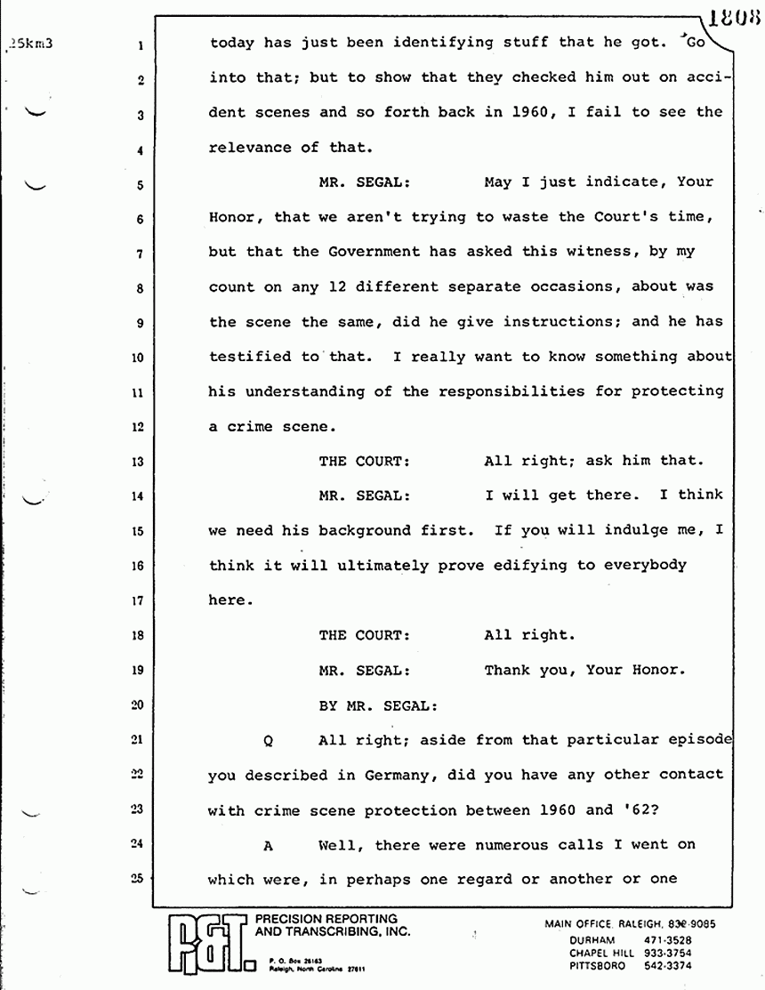 THE COURT: I have had complaints by the counsel and court officials about members of the press and others coming into the bar enclosure area at the times when we were in recess. I must ask you not to do that. We have hundreds and hundreds of exhibits here, and you see, the last witness there can't find his notebook or doesn't know where it is. In the interest of preserving this crime scene, we ask you not to come inside. If you want to talk to anybody about the case, and I can't imagine who would want to, but if you do, then, you will have to see them outside the Court, please. Take a recess until tomorrow morning at 9:30.