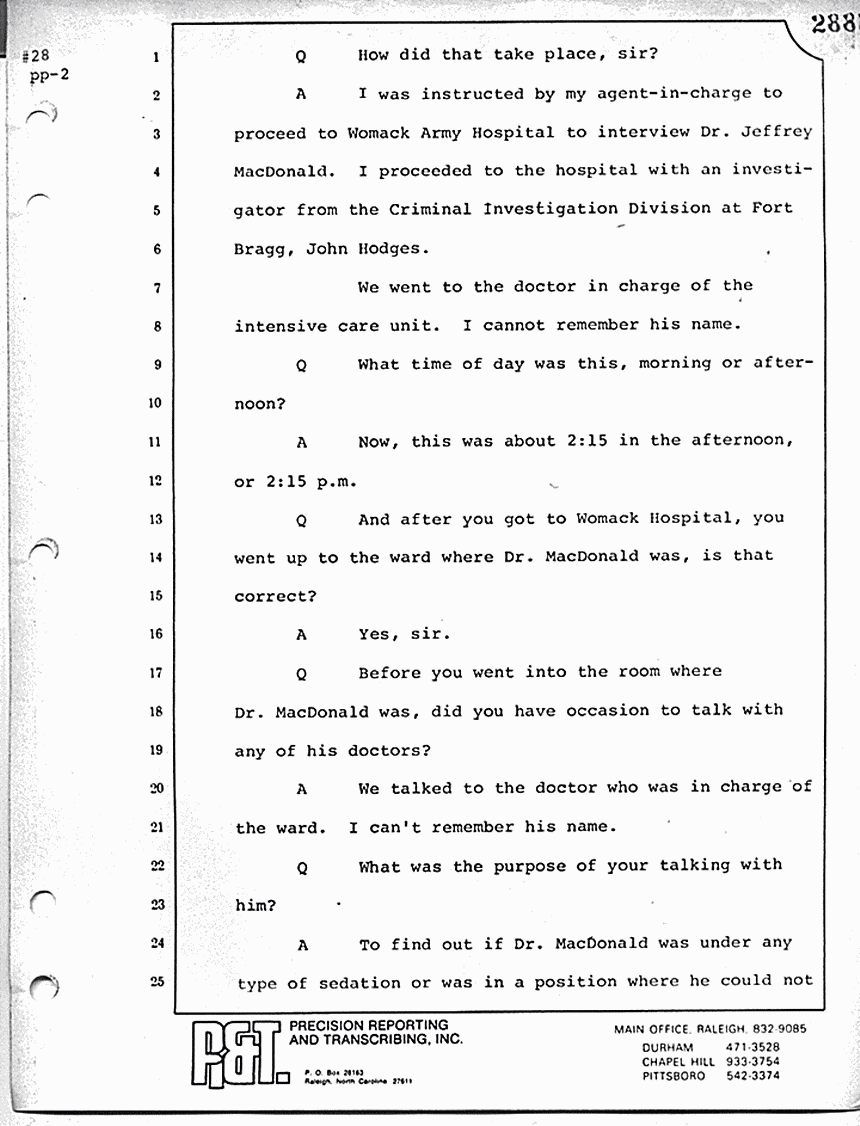 A I was instructed by my agent-in-charge to proceed to Womack Army Hospital to interview Dr. Jeffrey MacDonald. I proceeded to the hospital with an investigator from the Criminal Investigation Division at Fort Bragg, John Hodges. We went to the doctor in charge of the intensive care unit. I cannot remember his name.