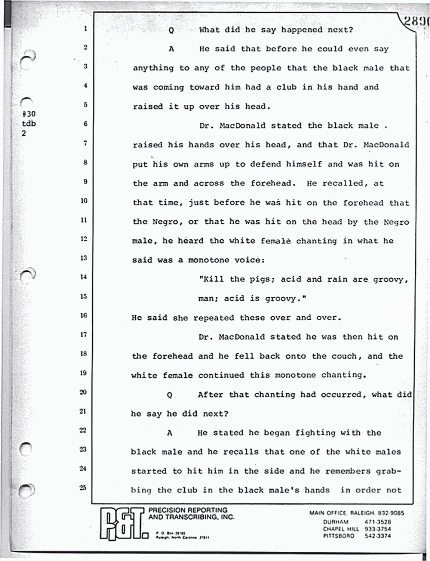 Dr. MacDonald stated the black male raised his hands over his head, and that Dr. MacDonald put his own arms up to defend himself and was hit on the arm and across the forehead. He recalled, at that time, just before he was hit on the forehead that the Negro, or that he was hit on the head by the Negro male, he heard the white female chanting in what he said was a monotone voice: "Kill the pigs; acid and rain are groovy, man; acid is groovy." He said she repeated these over and over.