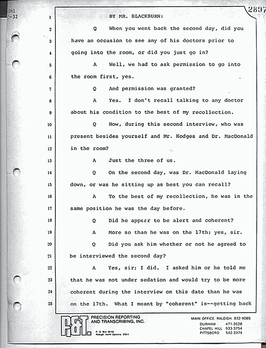 A Yes, sir; I did. I asked him or he told me that he was not under sedation and would try to be more coherent during the interview on this date than he was on the 17th. What I meant by "coherent" is -- getting back into sequence, I wanted to find out exactly what happened. The first day, Dr. MacDonald would jump from one thing to the other -- say from one room and then he would go to the telephone and then he would come back to finding the bodies. I was trying to get it in a logical sequence. He basically furnished the same information on the second day that he did on the previous interview on the 17th. The only exceptions that he recalled was that he and his wife had a drink of orange liqueur prior to her retiring for the evening. His wife went to bed prior to the end of the Johnny Carson Show and that his youngest daughter started crying after his wife had retired for the evening.
