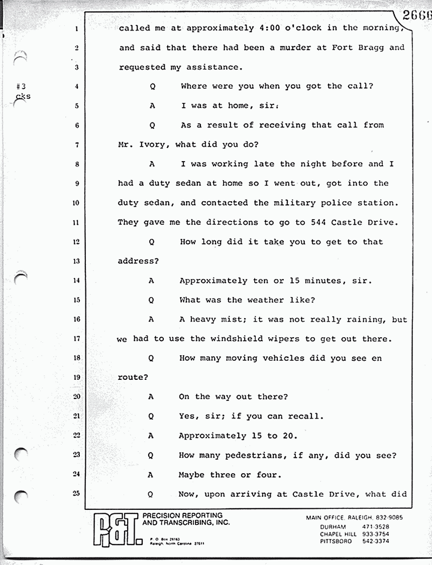 A I was working late the night before and I had a duty sedan at home so I went out, got into the duty sedan, and contacted the military police station. They gave me the directions to go to 544 Castle Drive.