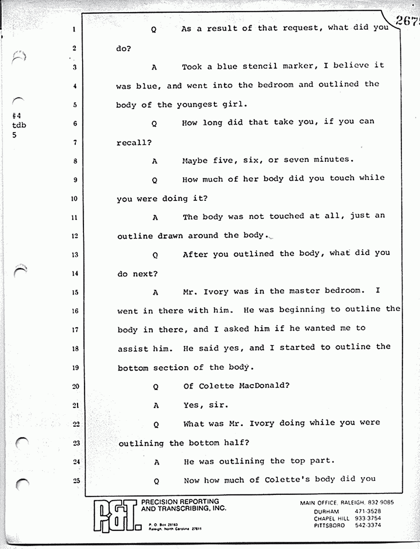 Q Now, how about in the room of Kimberly MacDonald? You told us that you went in there and that for whatever investigative purposes necessary that you had to move something; do you recall that? On the bed?