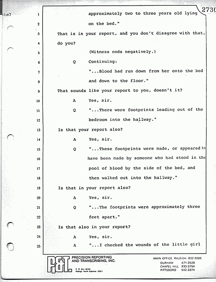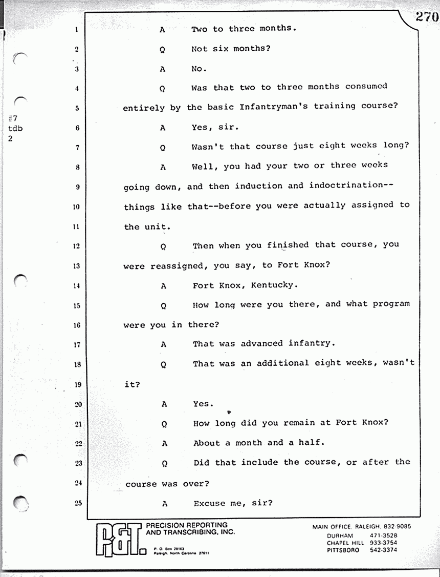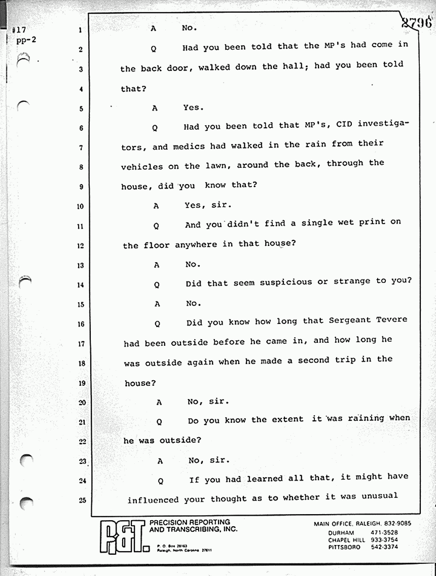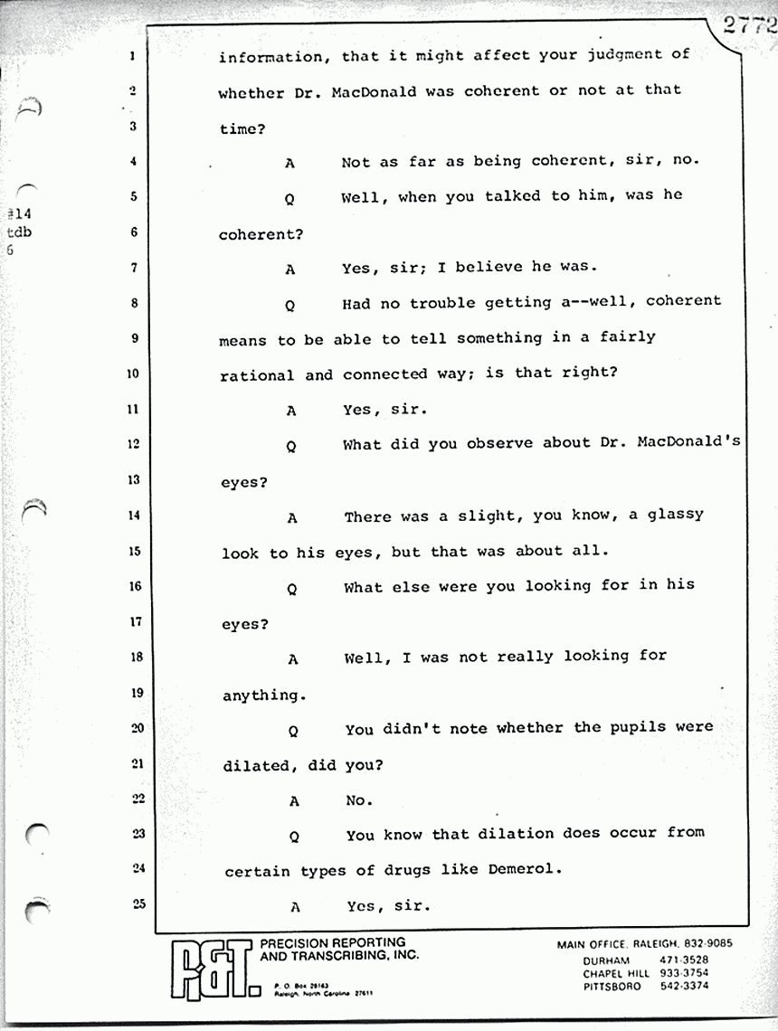 What is line 14? "Answer: Yes, sir. Question: And particularly, when he got to the point of Kristen and the gurgling. Answer: Right; he didn't want -- Question: -- and being in her room, that's when he would change the subject? Answer: That's right." Now, with respect to the military proceeding in 1970, do you know whether or not those proceedings were open or closed?