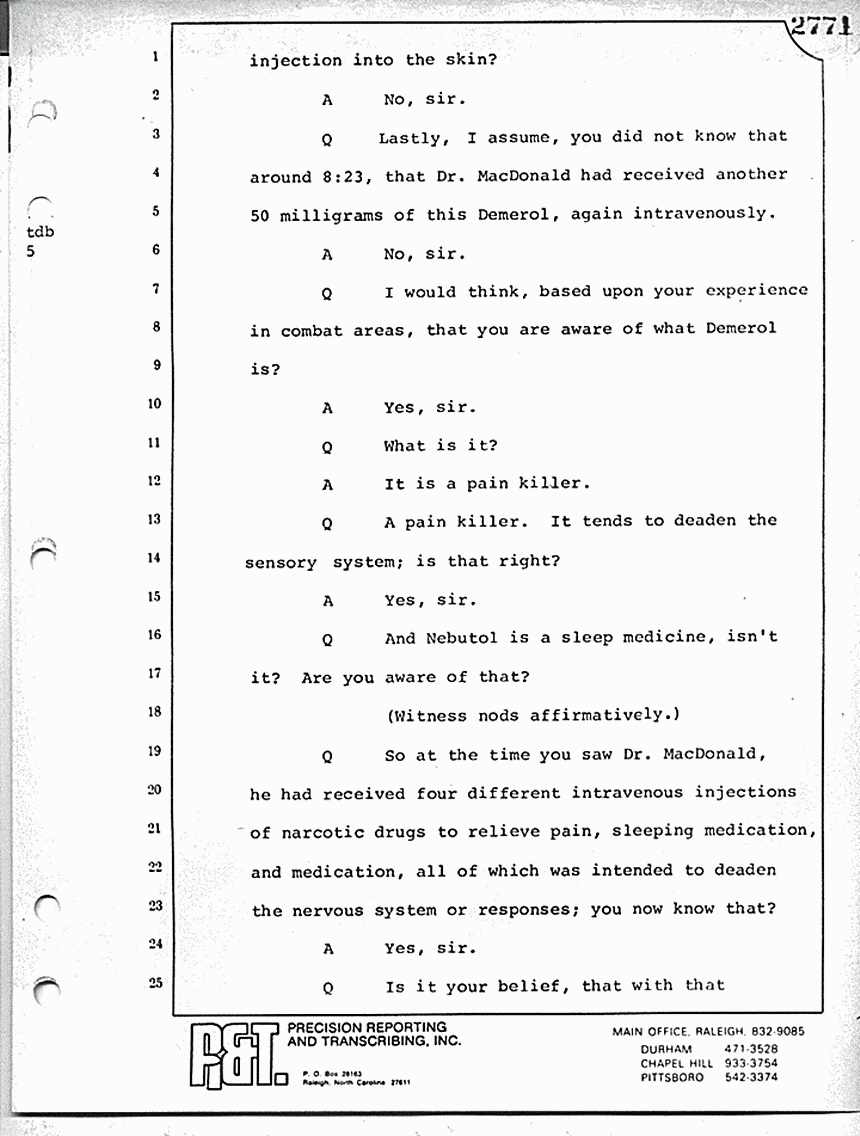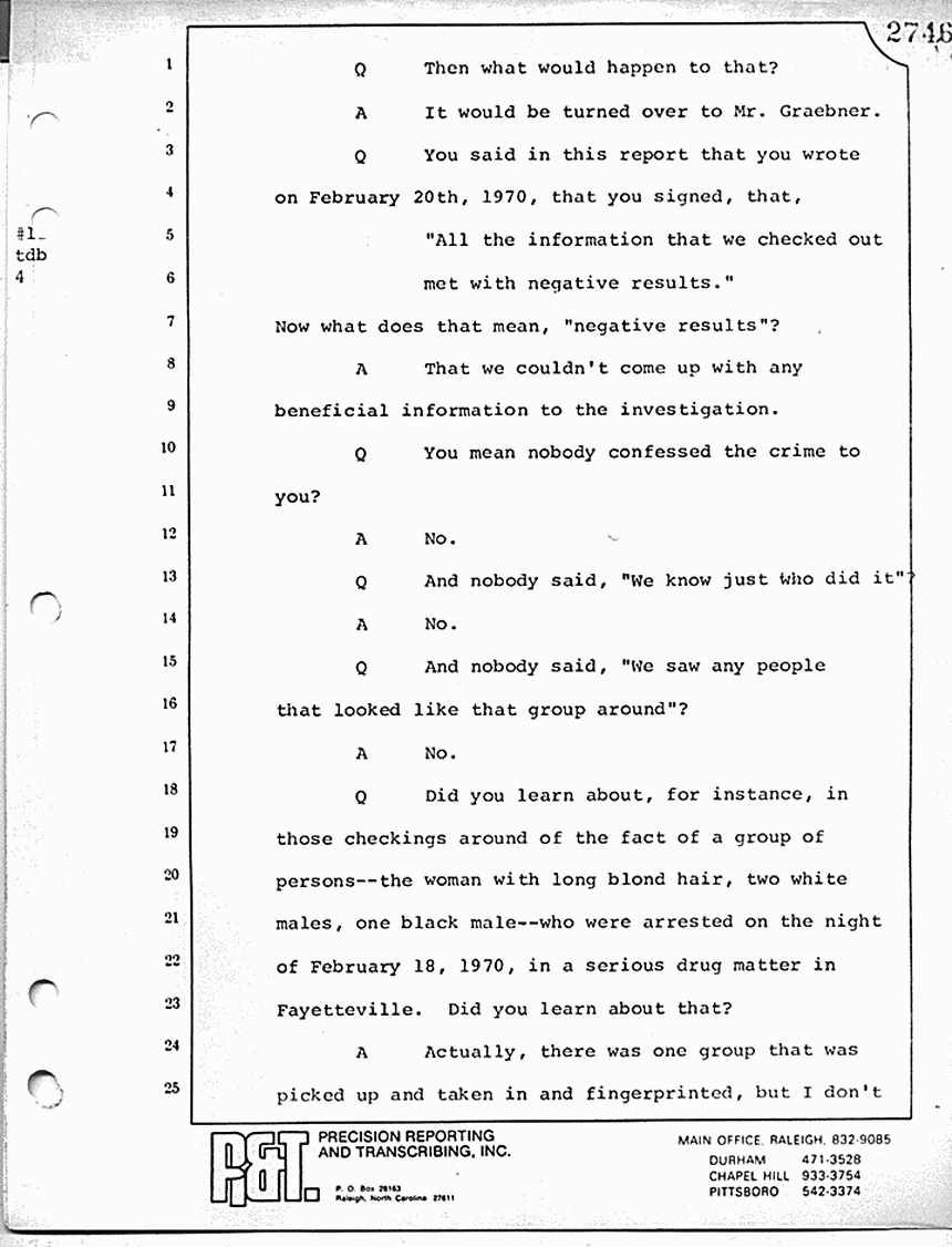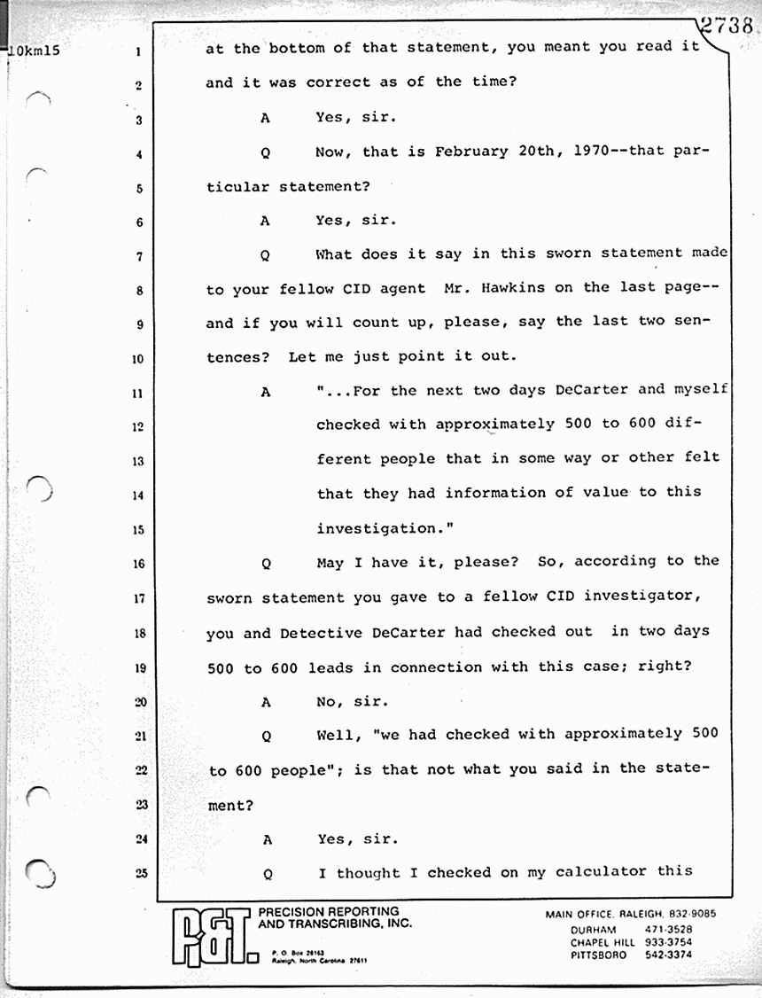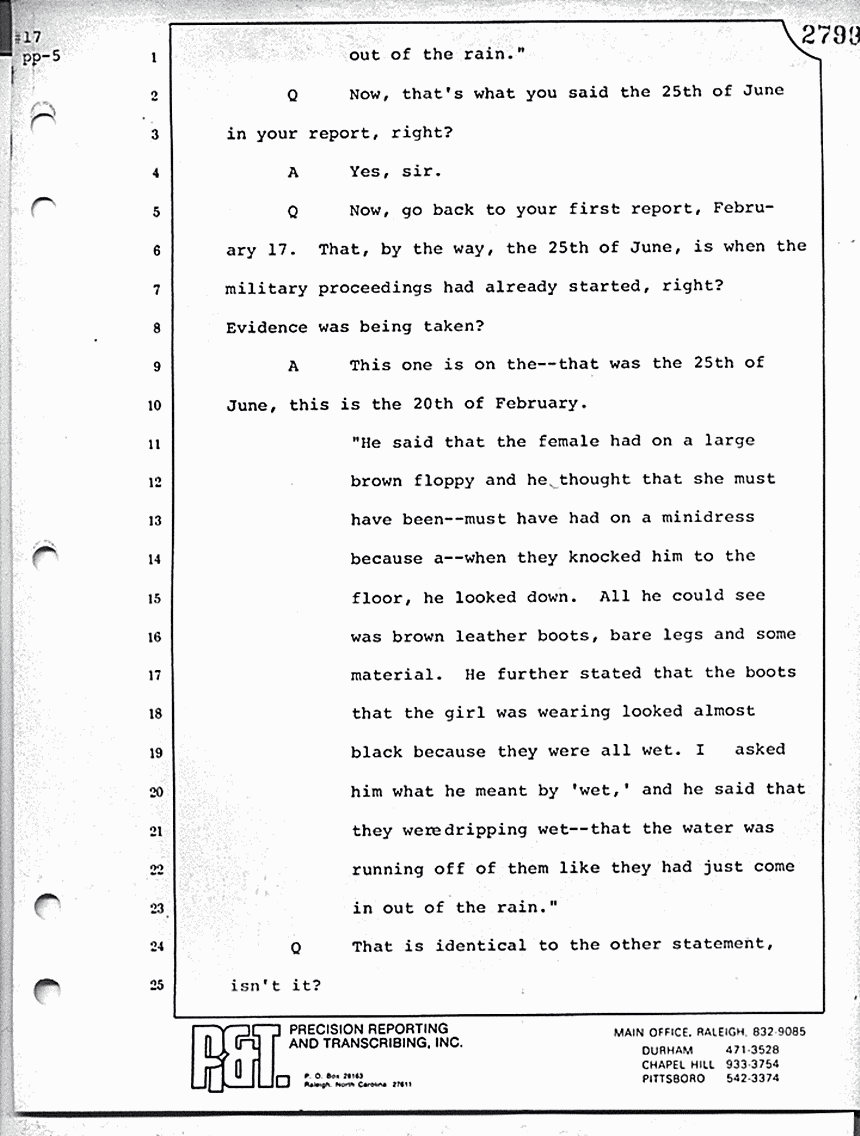 What is line 14? "Answer: Yes, sir. Question: And particularly, when he got to the point of Kristen and the gurgling. Answer: Right; he didn't want -- Question: -- and being in her room, that's when he would change the subject? Answer: That's right." Now, with respect to the military proceeding in 1970, do you know whether or not those proceedings were open or closed?