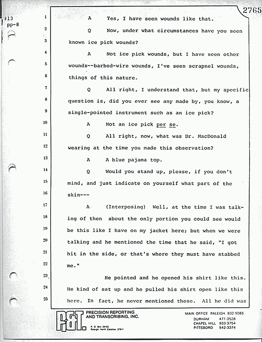A When I was interviewing Mr. MacDonald in the hospital and I asked him, he was talking about when he got hit with the ice pick. At this time is when he -- he was sitting in the bed like this here and his jacket was kind of closed. He opened his jacket up and he pointed to the one area where there was a bandage. There was marks coming down on his chest and there was one straight line; they were not straight up and down. They were straight from the shoulder in toward where the bandage was at. It appeared that he had been scratched.