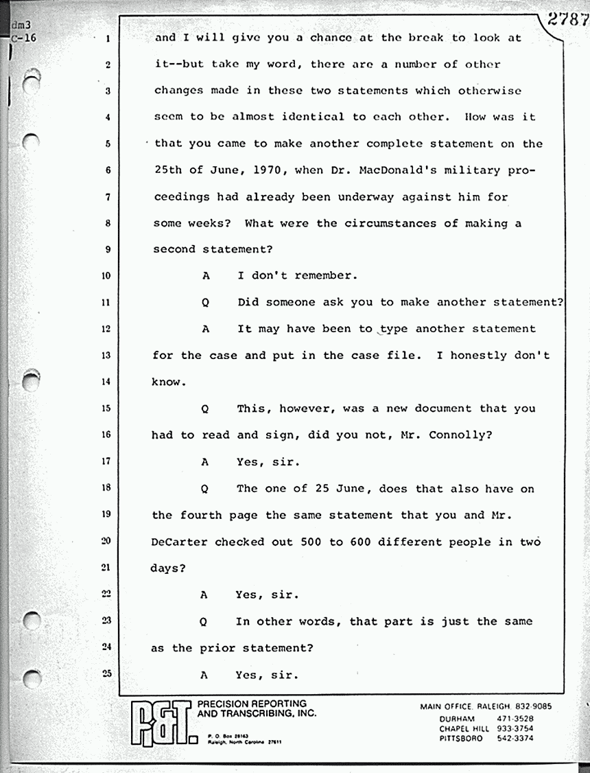 Q Let me find something and read it to you, if I may, and ask whether it refreshes your recollection in any way. Oh, all right, forgive me. In this war of paper here, I lose track too. Let me read you a statement and ask whether it either refreshes your recollection or you are willing to accept this as a statement of what was said to Lieutenant Malley who purports to have interviewed you on 18 August 1970; all right, Mr. Connolly? Quoting you as describing what Dr. MacDonald said: "MacDonald said the jacket one of the assailants had on was reddish. It isn't clear whether it was MacDonald, or Connolly, or both but Connolly stated in the report that it was red simply as a way of grossly describing it. It might have been maroon, et cetera." Now, does that suggestion there that you said to Lieutenant Malley that red was the way of describing it in any way refresh your recollection as to whether Dr. MacDonald specifically said red?