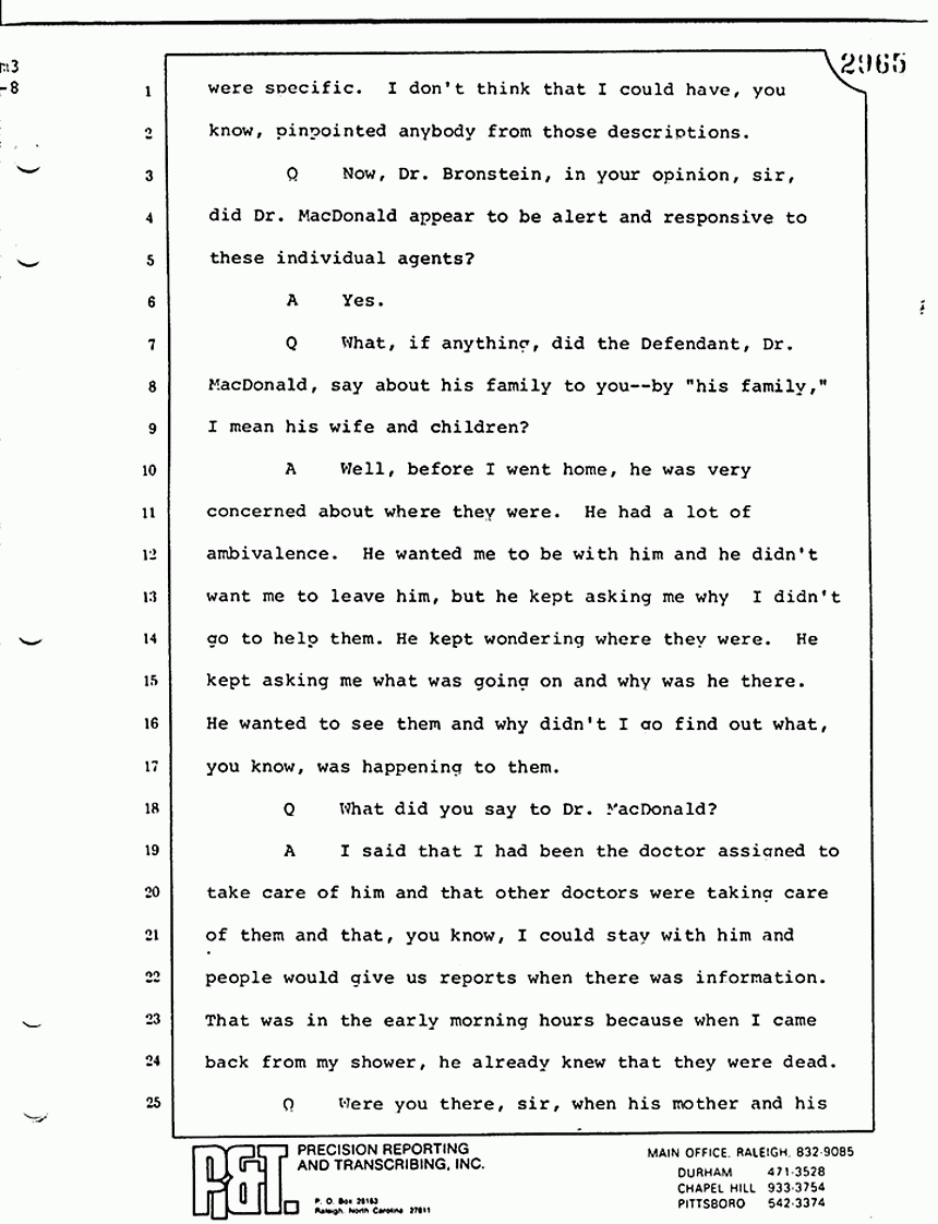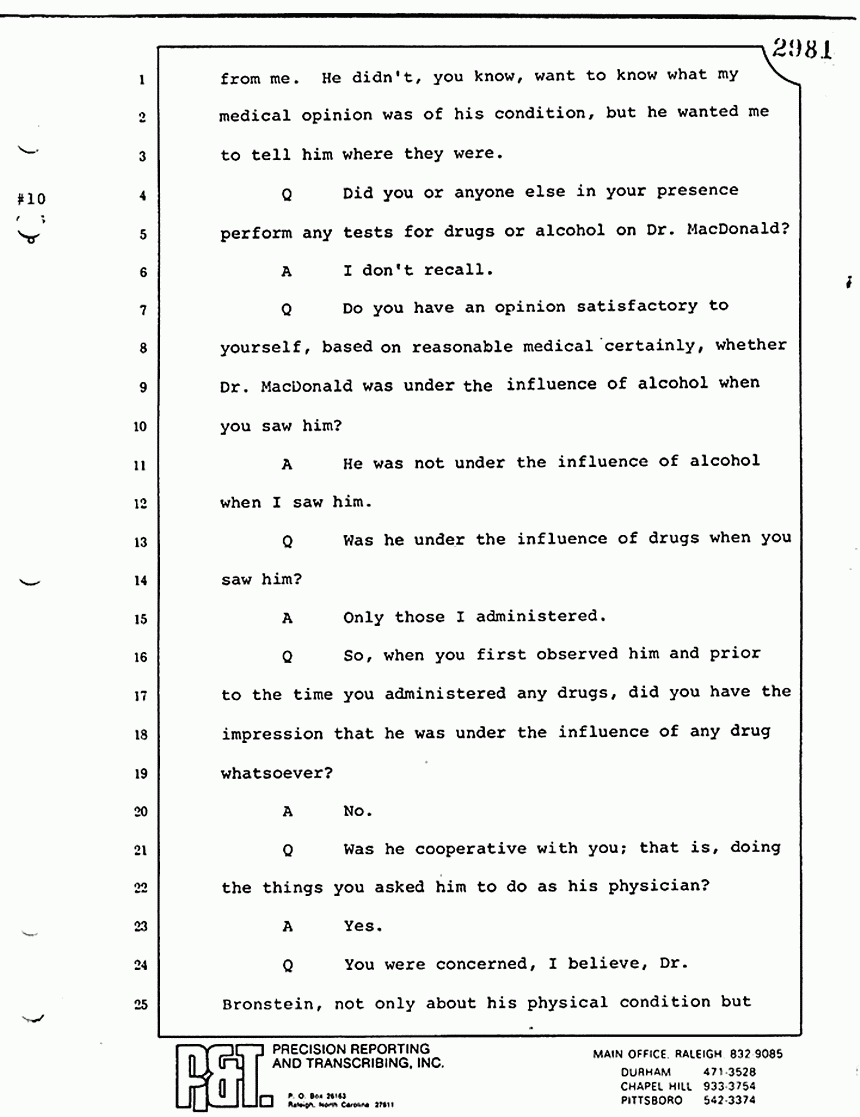 Q After this first 15 or 20 minutes went by, Dr. Bronstein, what did you do next in your medical treatment of Dr. MacDonald?