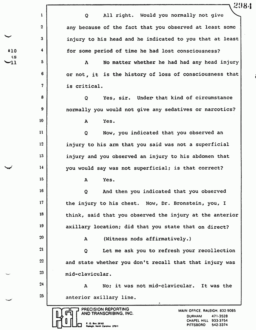 Q And then you indicated that you observed the injury to his chest. Now, Dr. Bronstein, you, I think, said that you observed the injury at the anterior axillary location; did that you state that on direct?