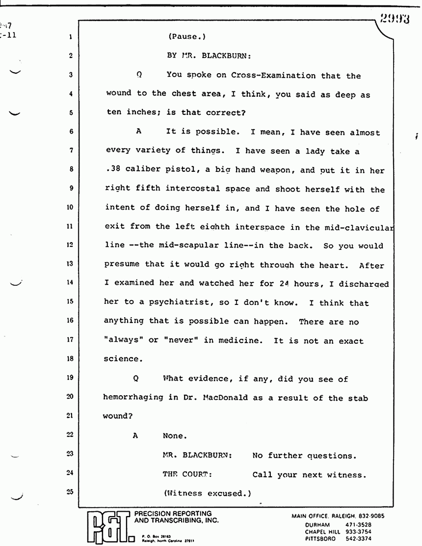 Q What evidence, if any, did you see of hemorrhaging in Dr. MacDonald as a result of the stab wound?