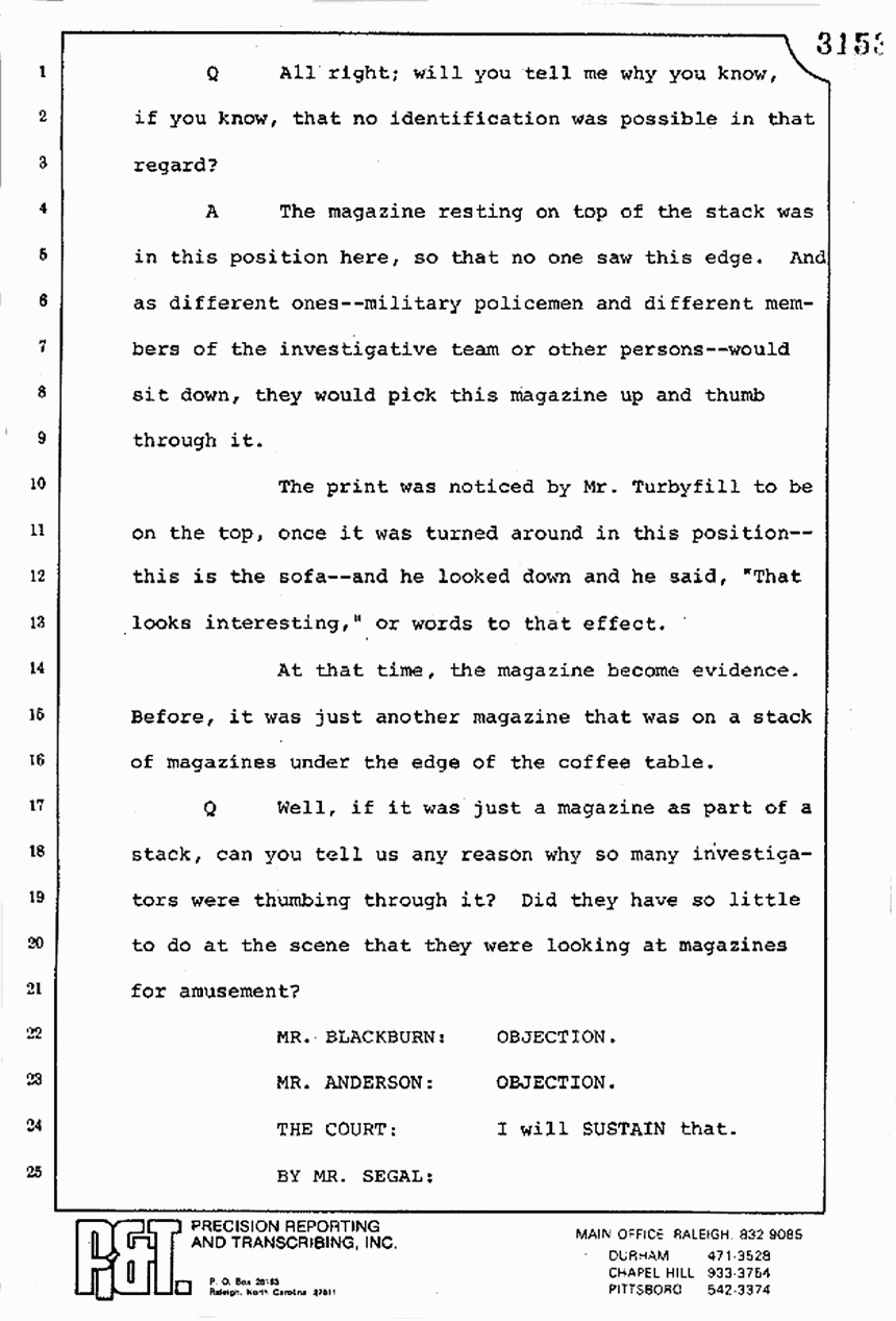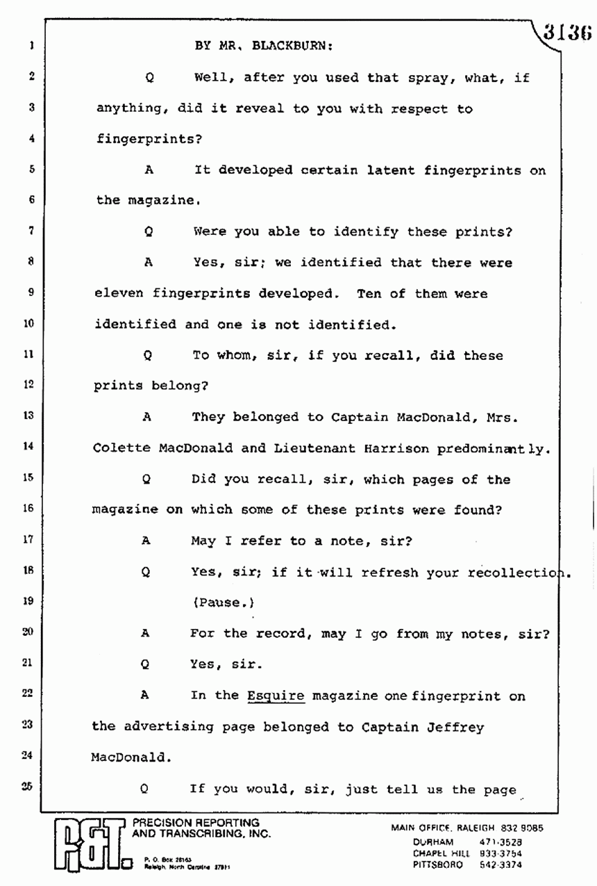 A In the Esquire magazine one fingerprint on the advertising page belonged to Captain Jeffrey MacDonald.