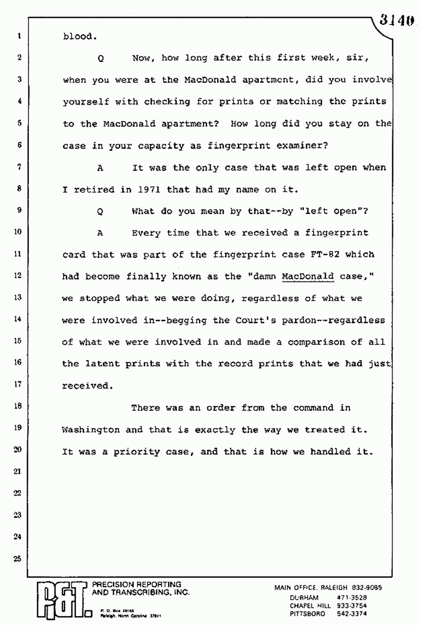 Q In your investigation, sir, or in your analysis of the prints that were inside the MacDonald apartment, did you ever have occasion to examine those prints, sir, with the prints that you dusted for in the MacDonald apartment?