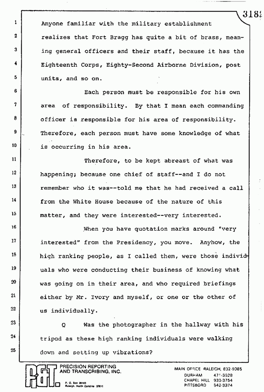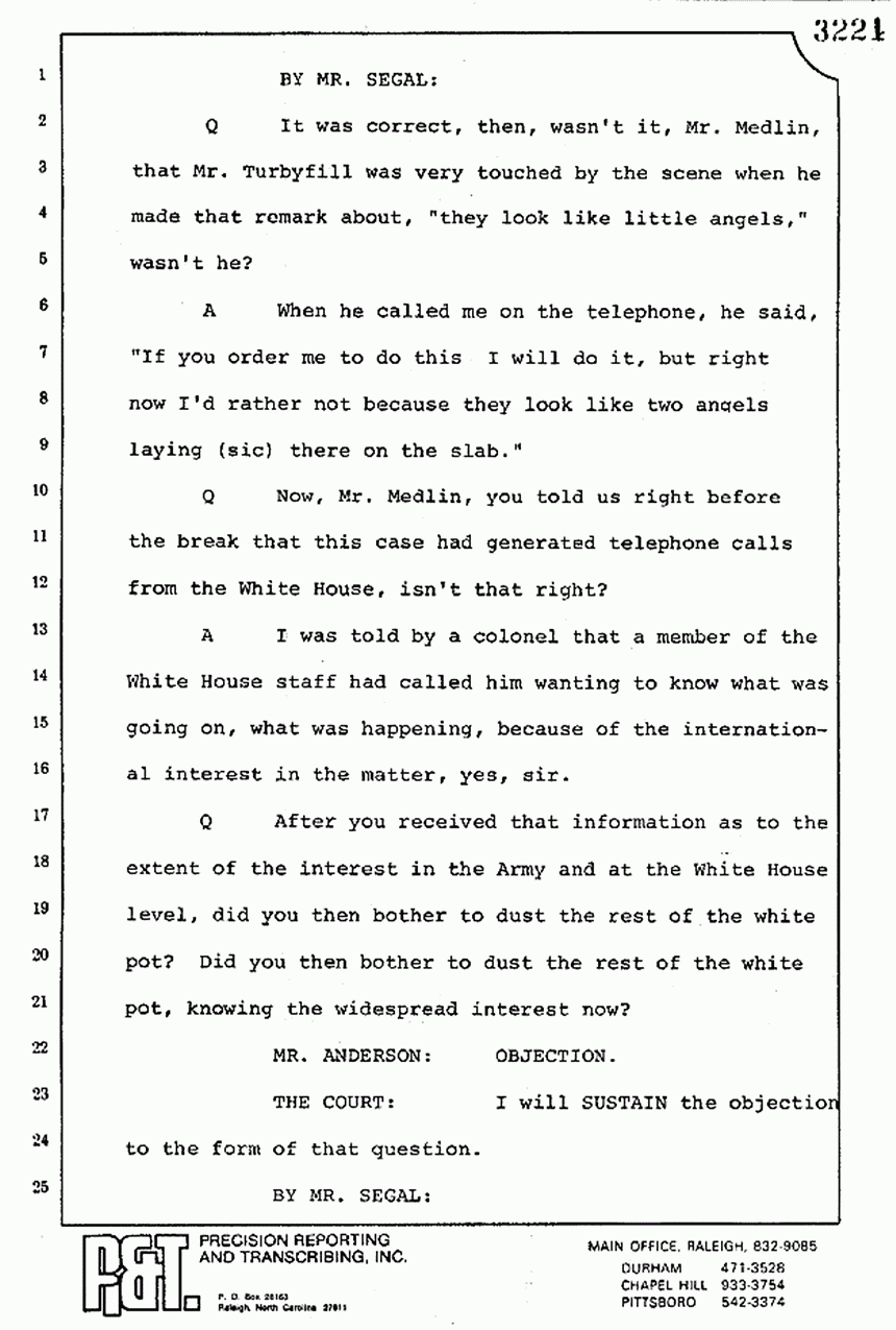 Q All right, let me put it to you this way, Mr. Medlin. Having become aware that there was interest in the case at the highest levels, did that pot cause you to rethink whether or not you should dust the entire white pot, or simply rest with the one little area that you dusted?