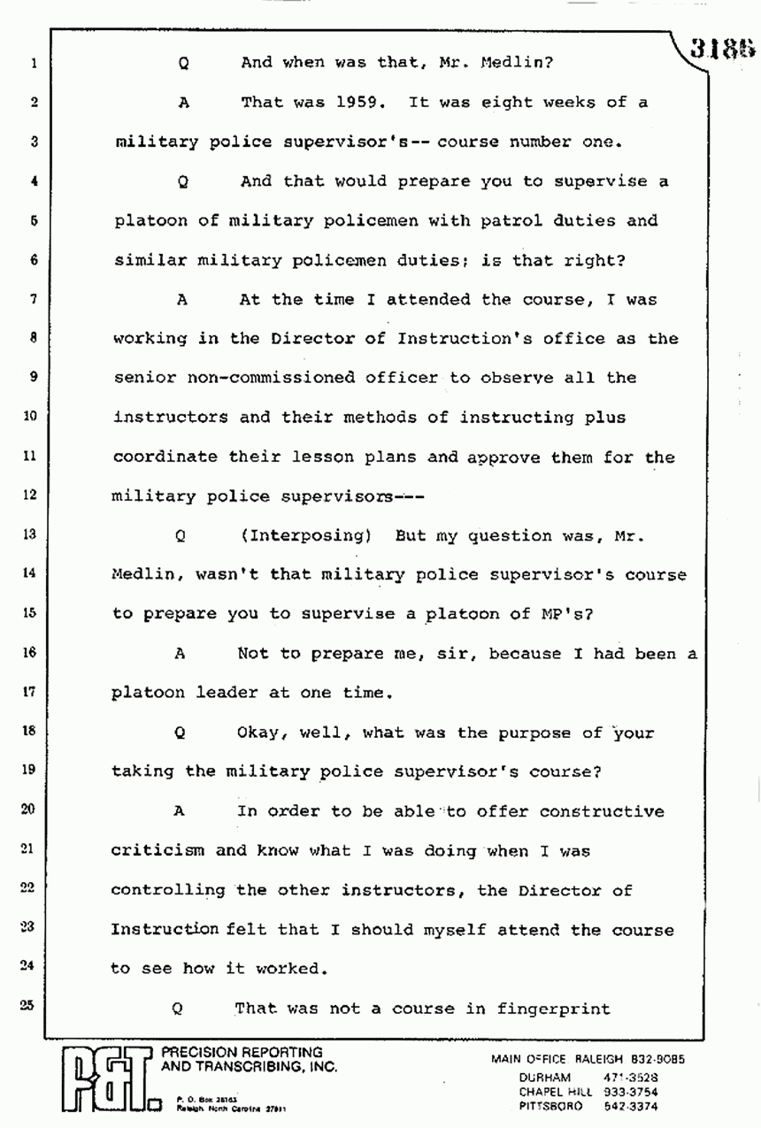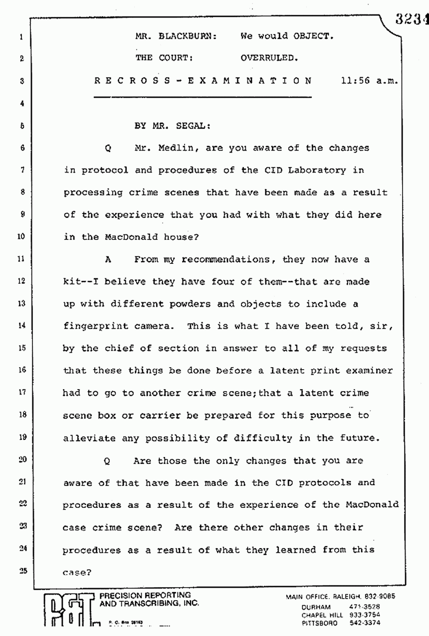 Q Mr. Medlin, are you aware of the changes in protocl and procedures of the CID Laboratory in processing crime scenes that have been made as a result of the experience that you had with what they did have in the MacDonald house?