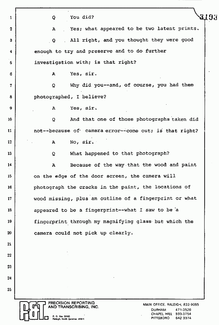 Q Mr. Medlin, just a moment ago on Cross-Examination, you were talking about Kristen's prints, and you said, I believe, in response to a question by Mr. Segal, that the ridges would be too fine on her hands; is that correct?