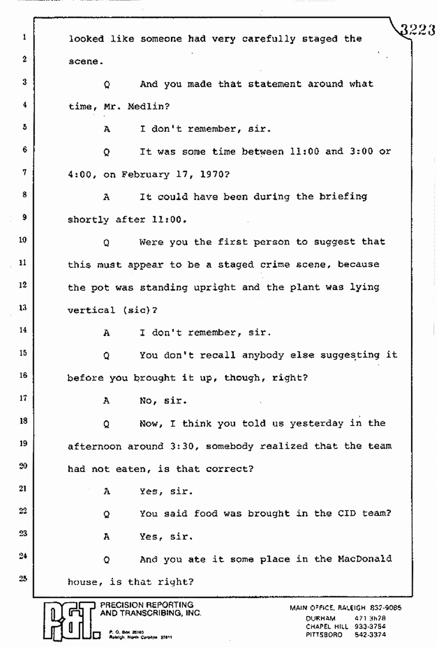 Q Mr. Medlin, aren't you one of the people who suggested, seeing the white pot standing upright, that it looked like a staged crime scene because the plant was lying horizontally?