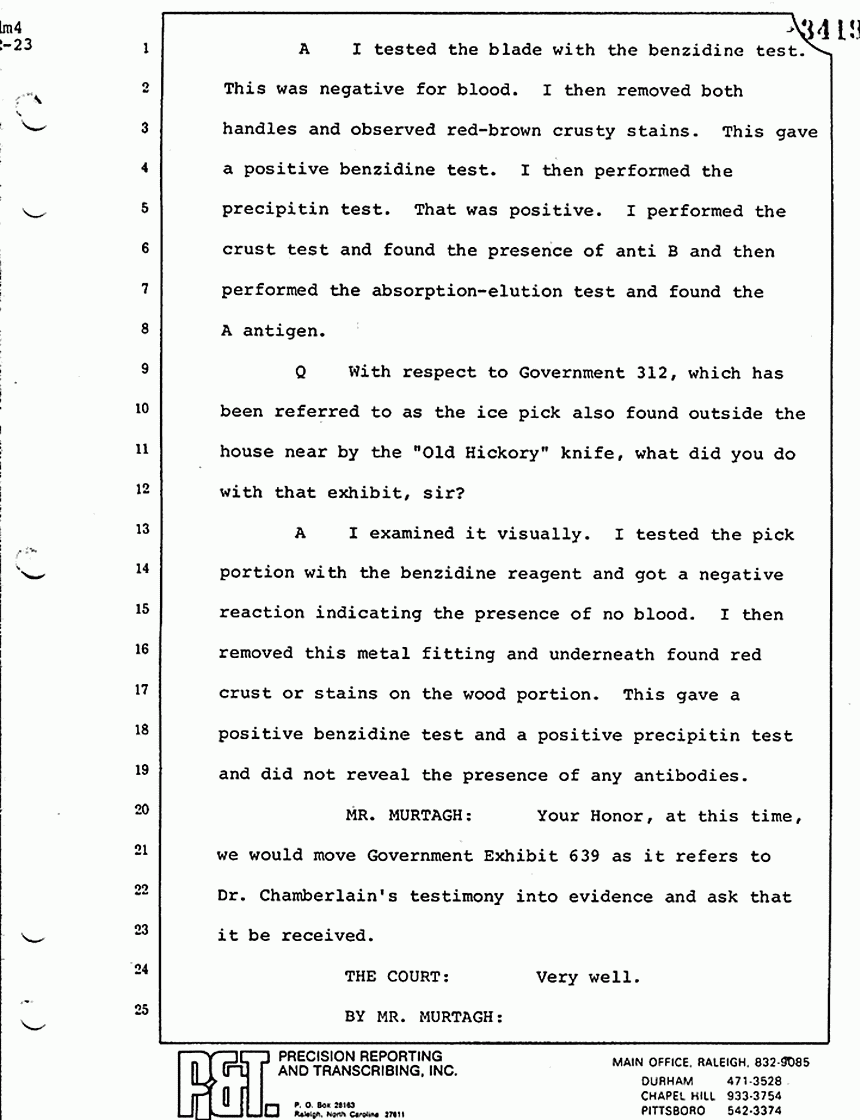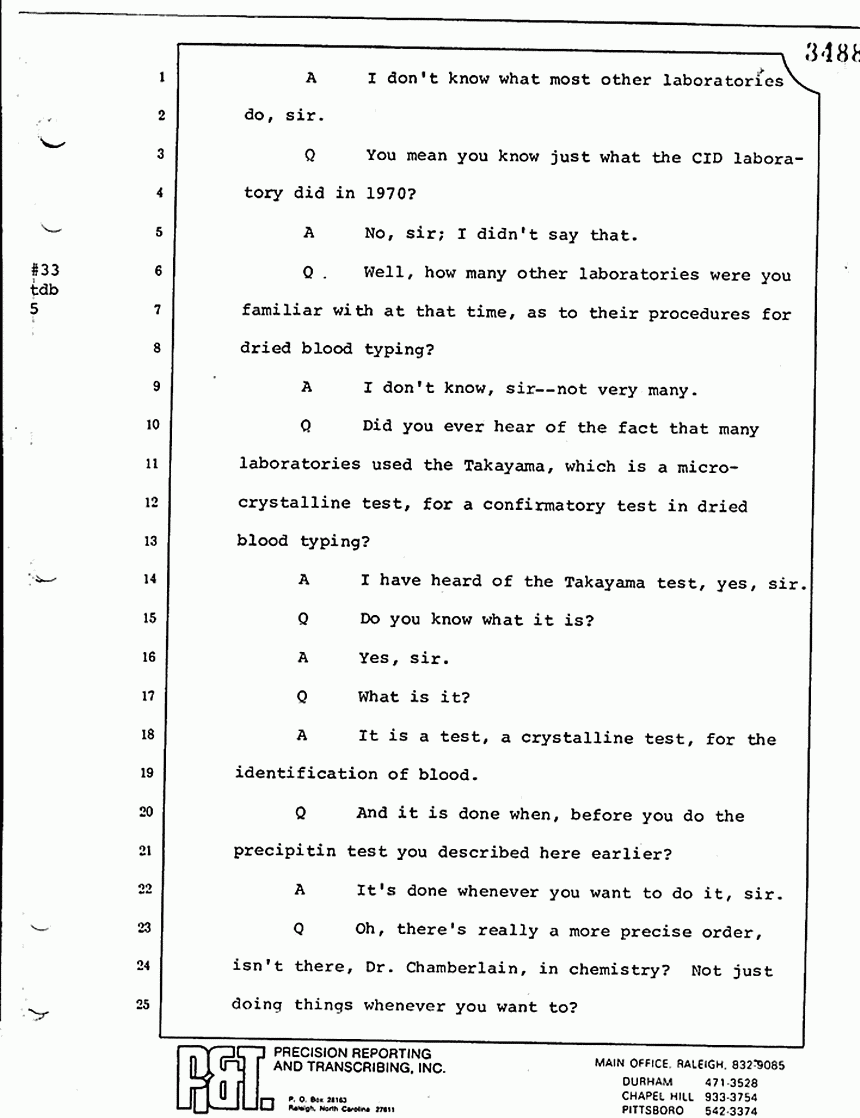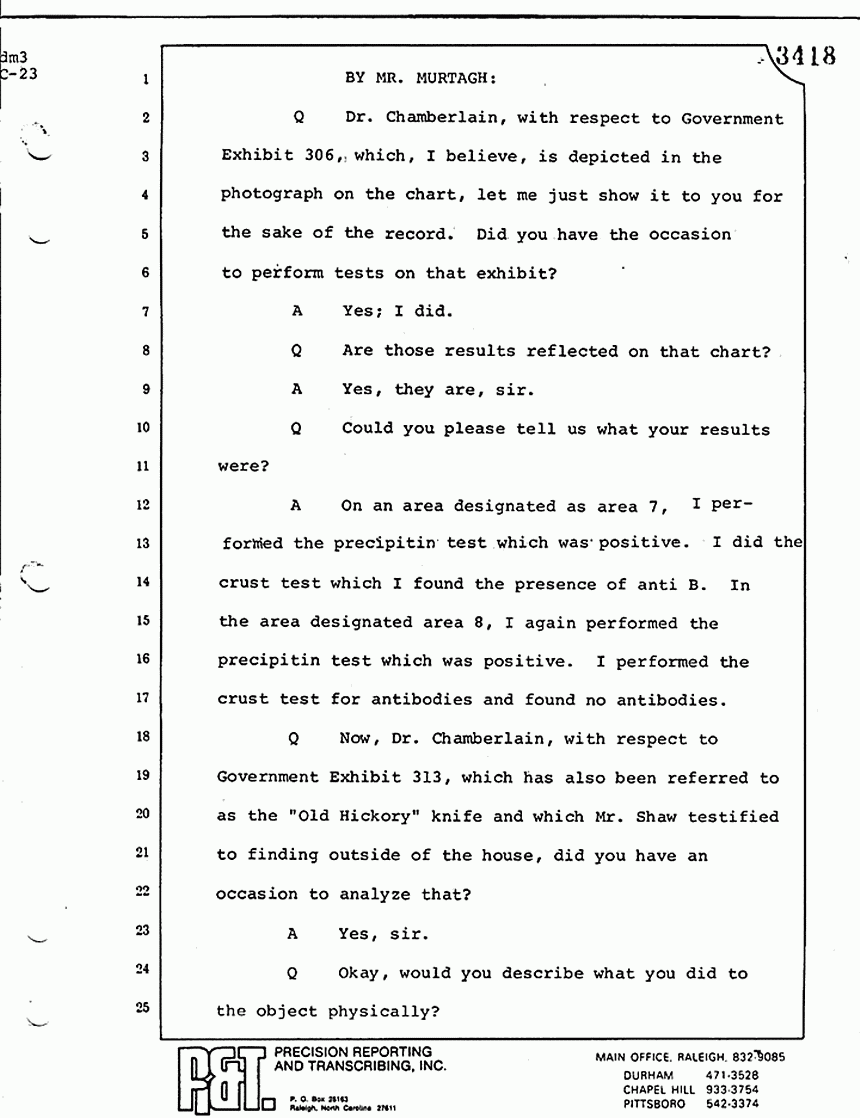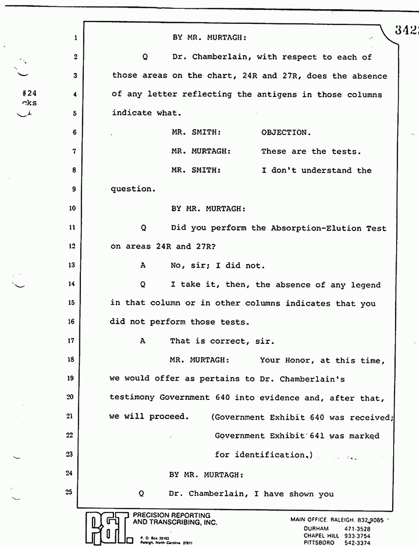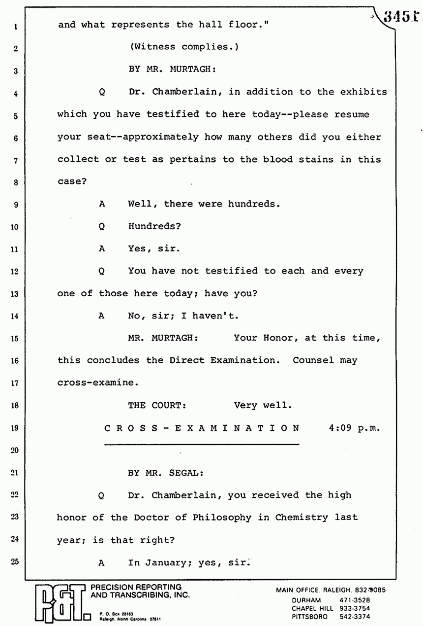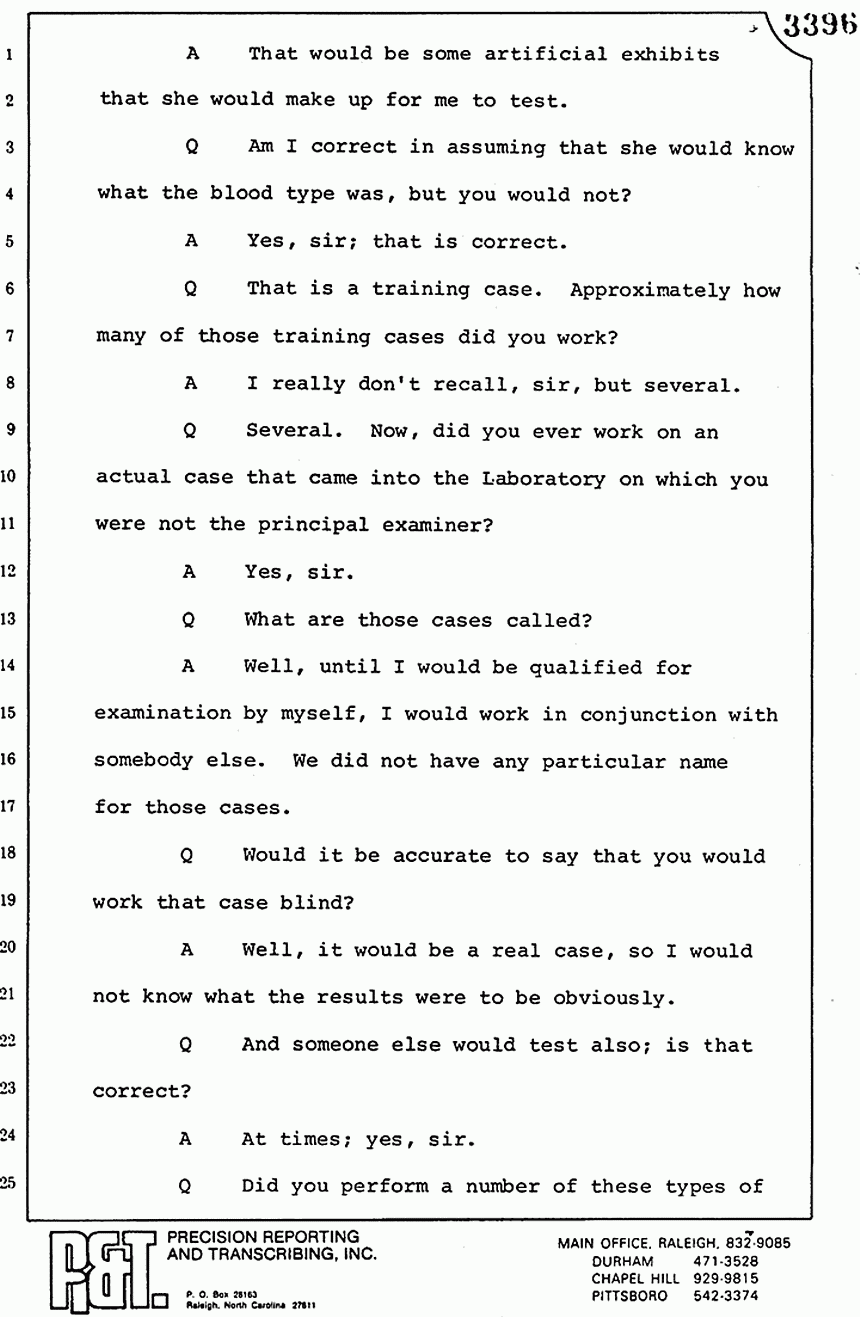 Q All right, let me ask a couple of other questions. Dr. Chamberlain, there are several hundred of these tests that you performed for dried blood stains, were there not, that you participated in performing tests?