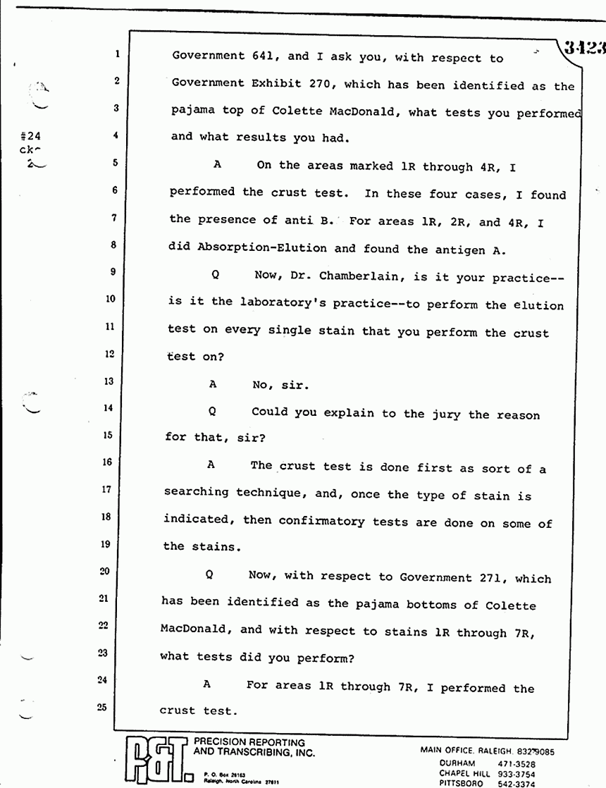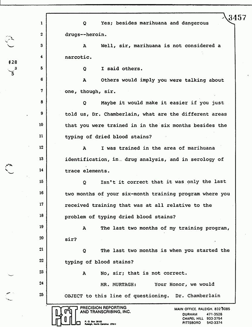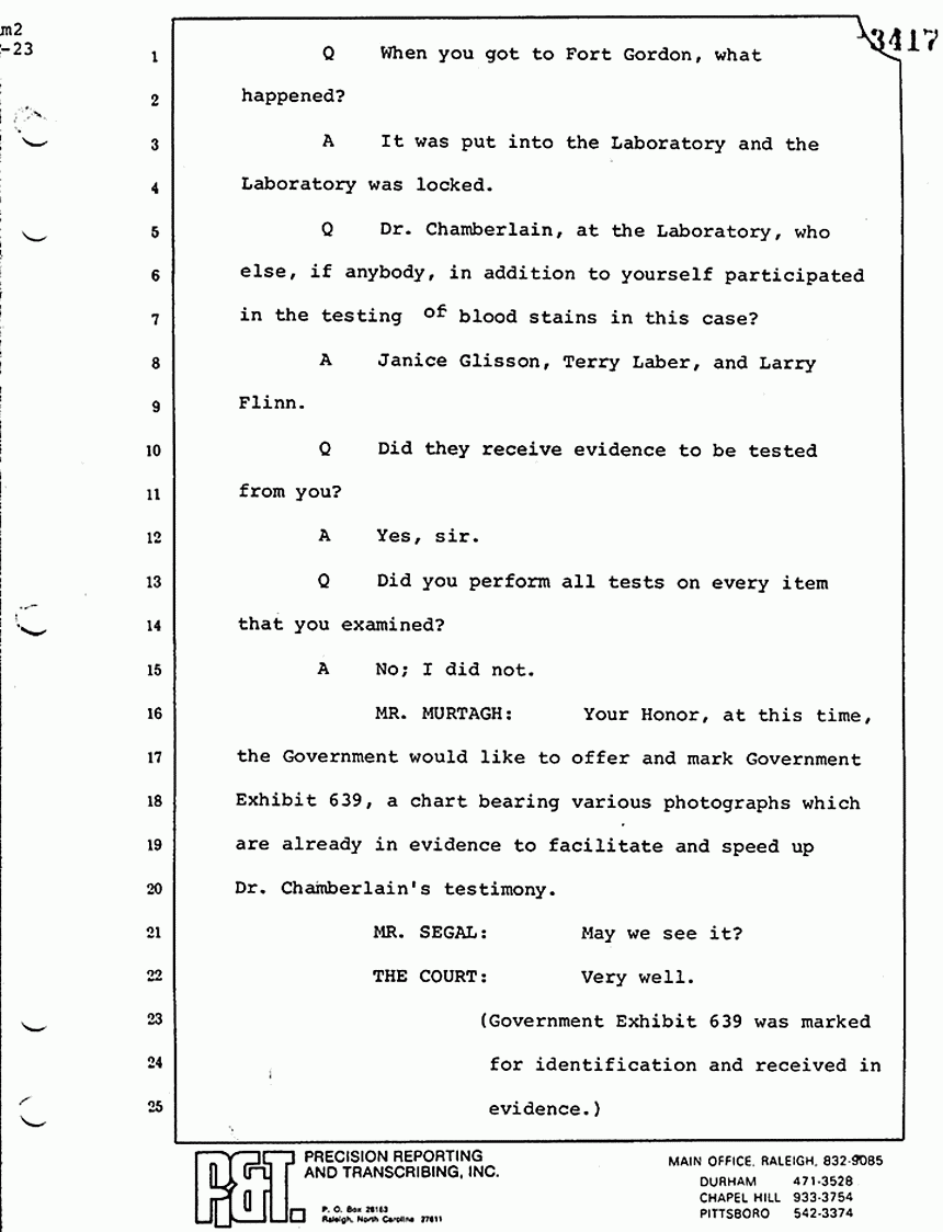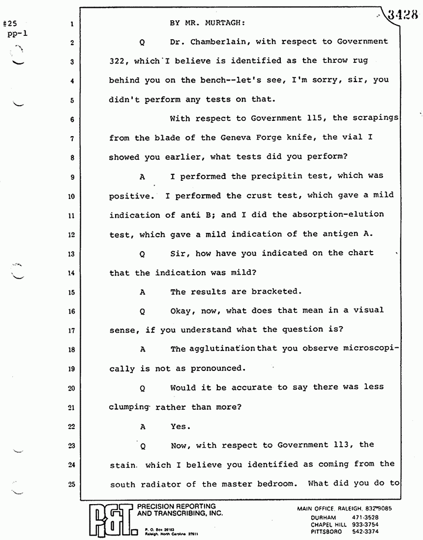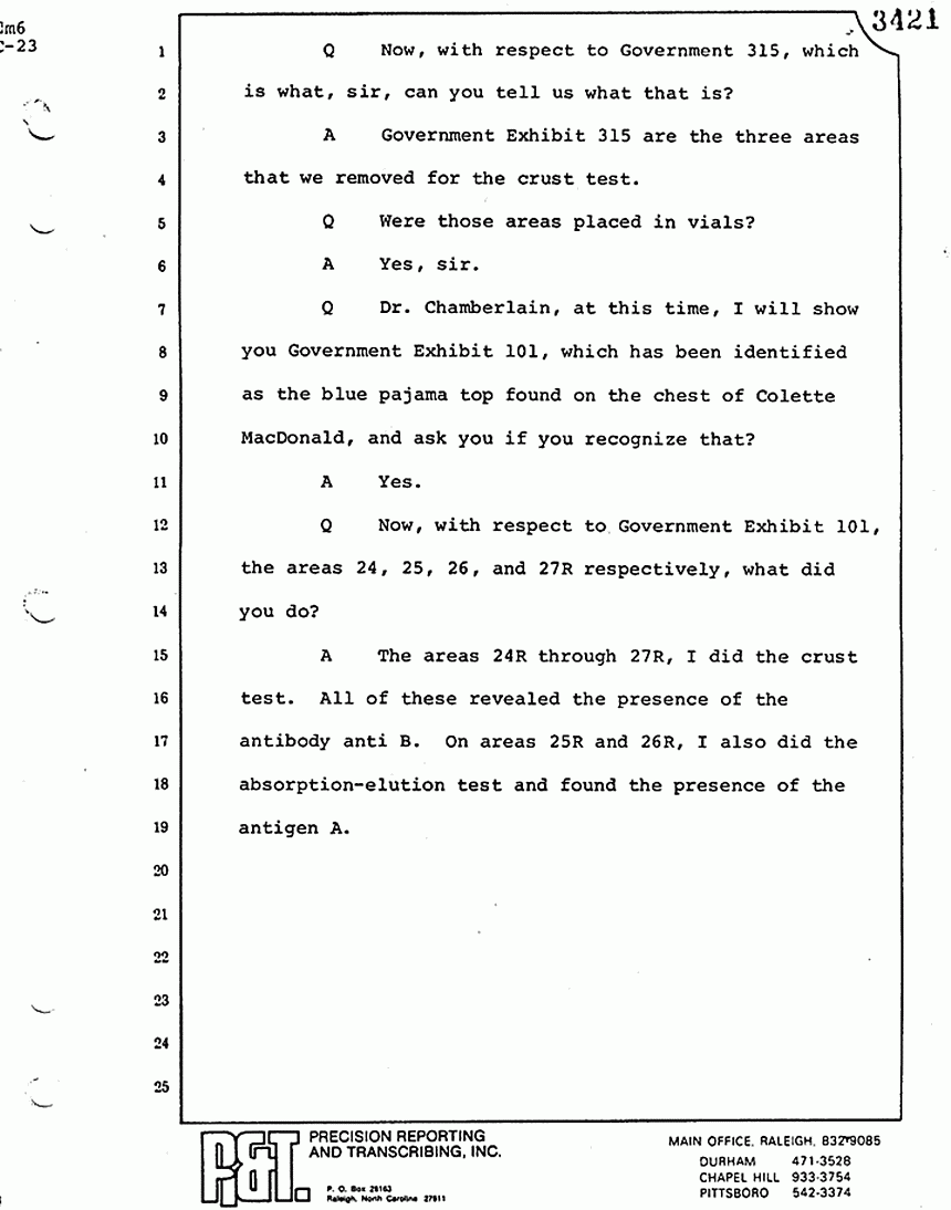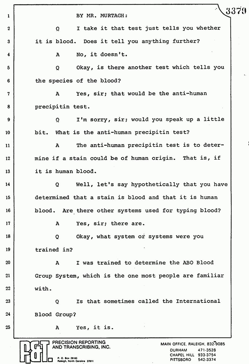 Q All right, let me ask a couple of other questions. Dr. Chamberlain, there are several hundred of these tests that you performed for dried blood stains, were there not, that you participated in performing tests?