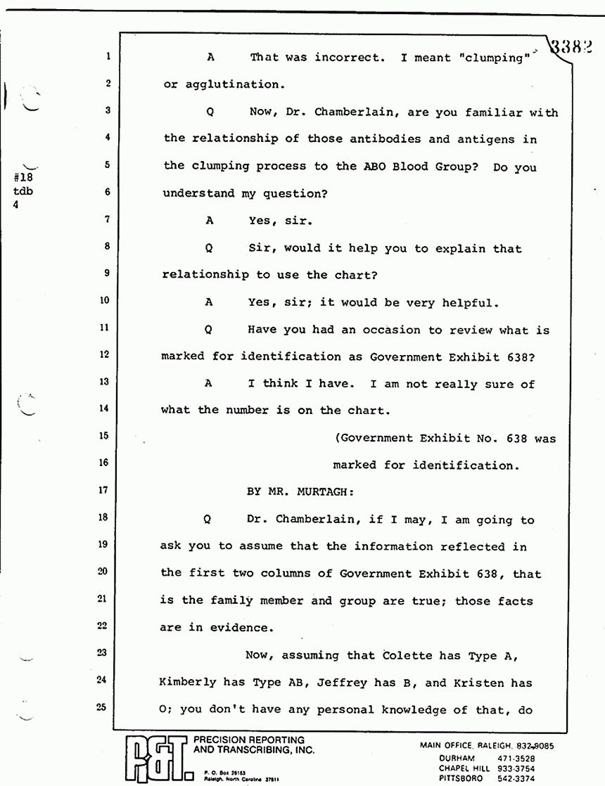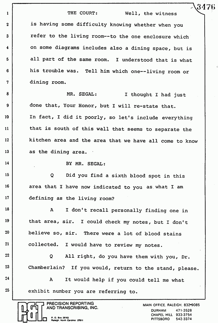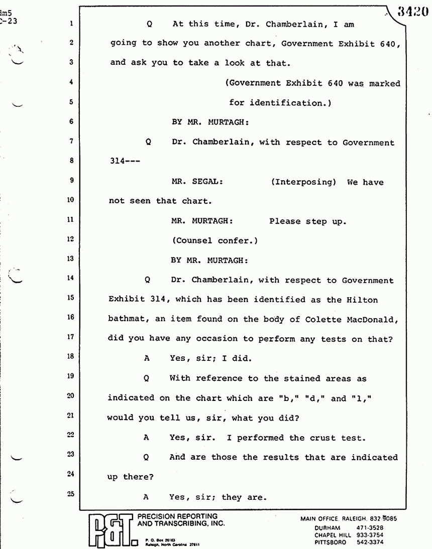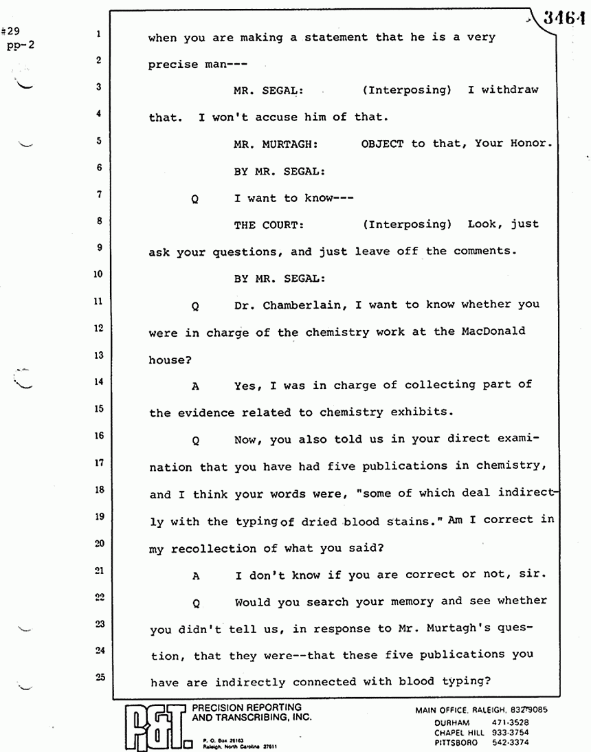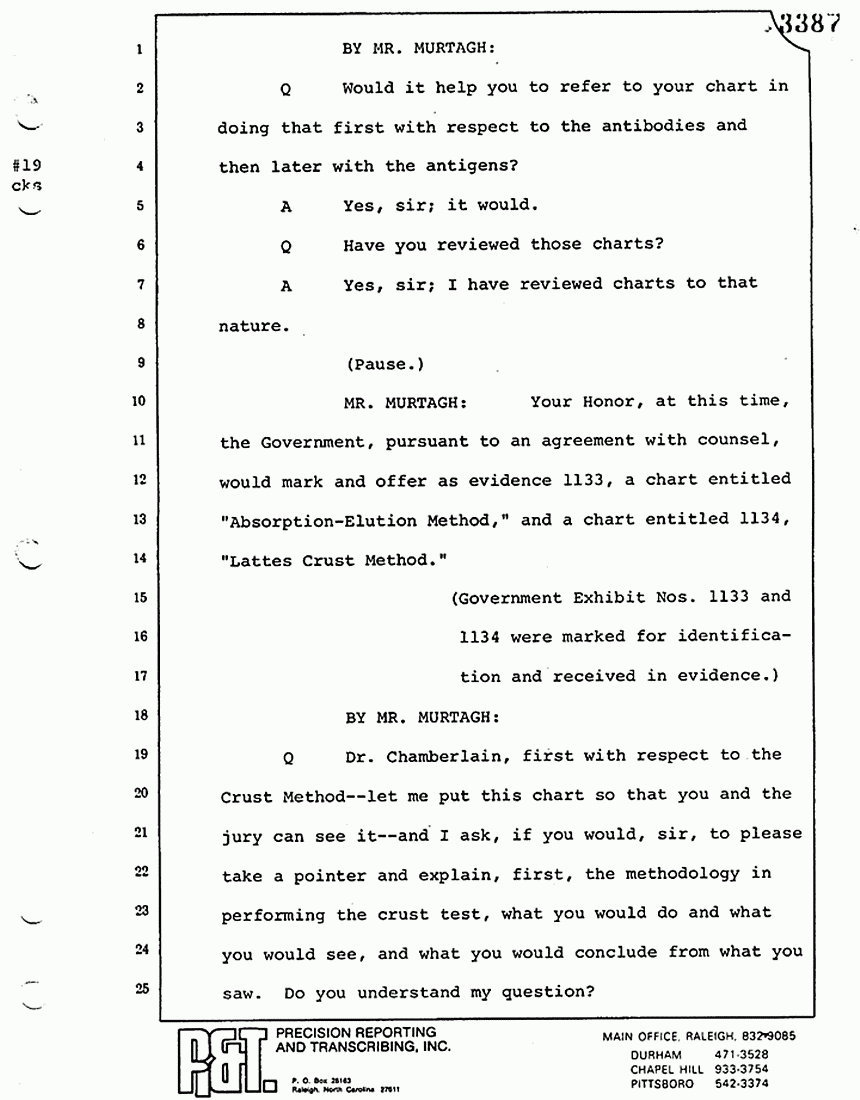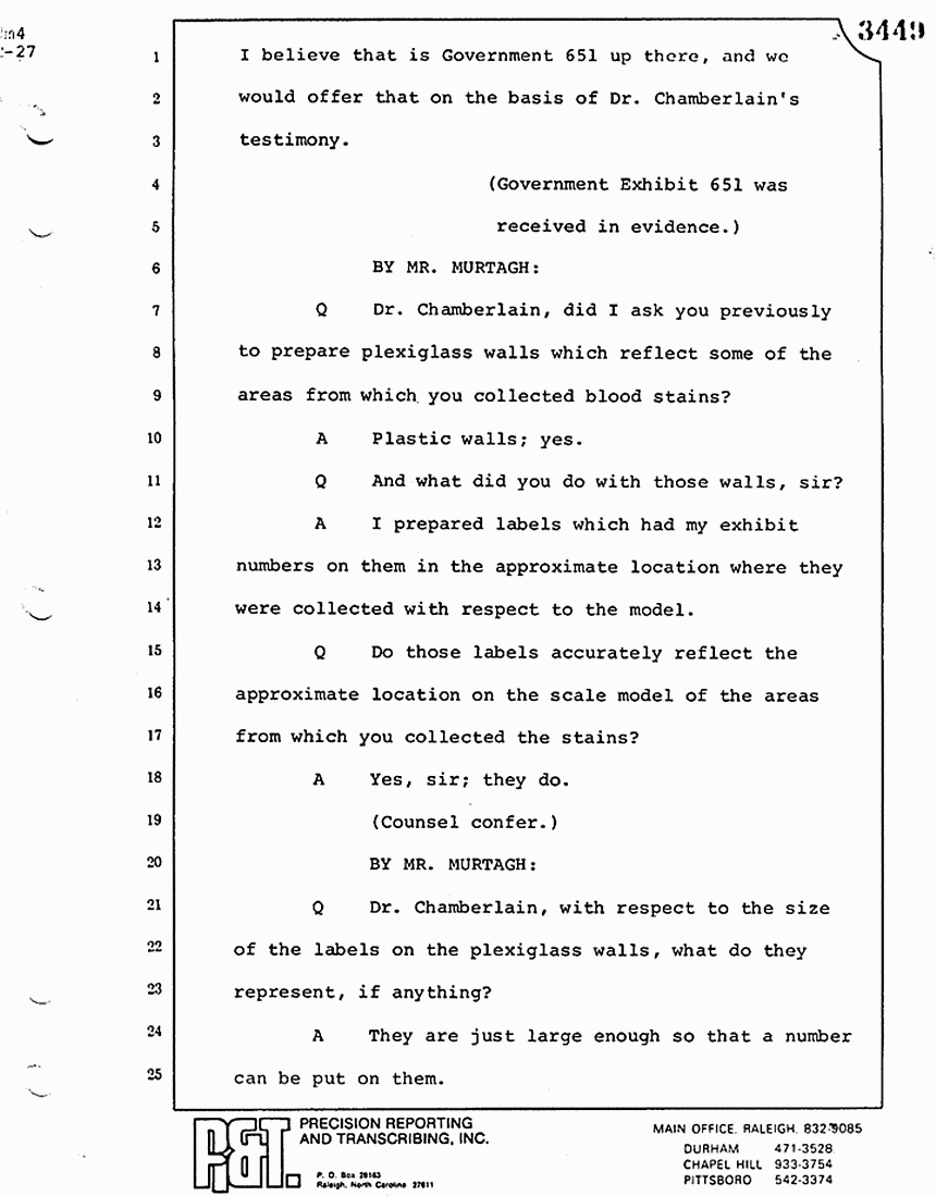 Q All right, let me ask a couple of other questions. Dr. Chamberlain, there are several hundred of these tests that you performed for dried blood stains, were there not, that you participated in performing tests?