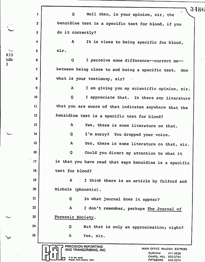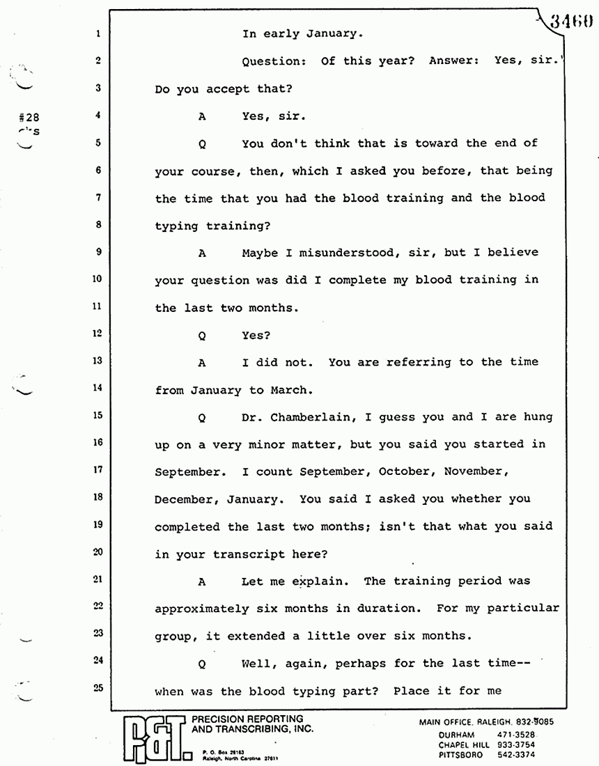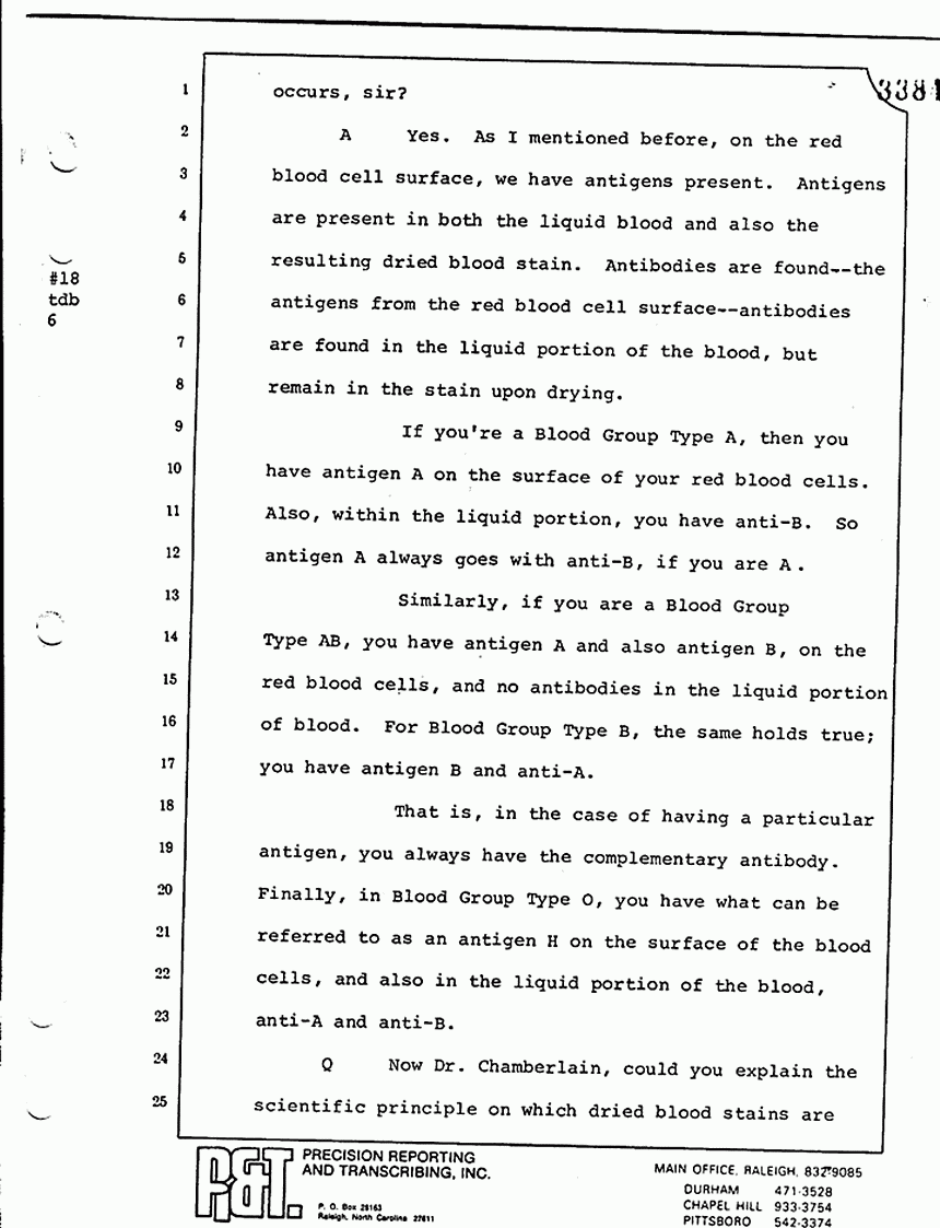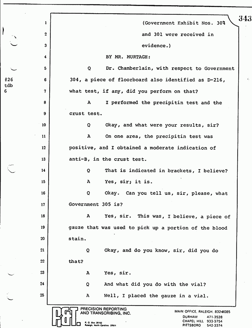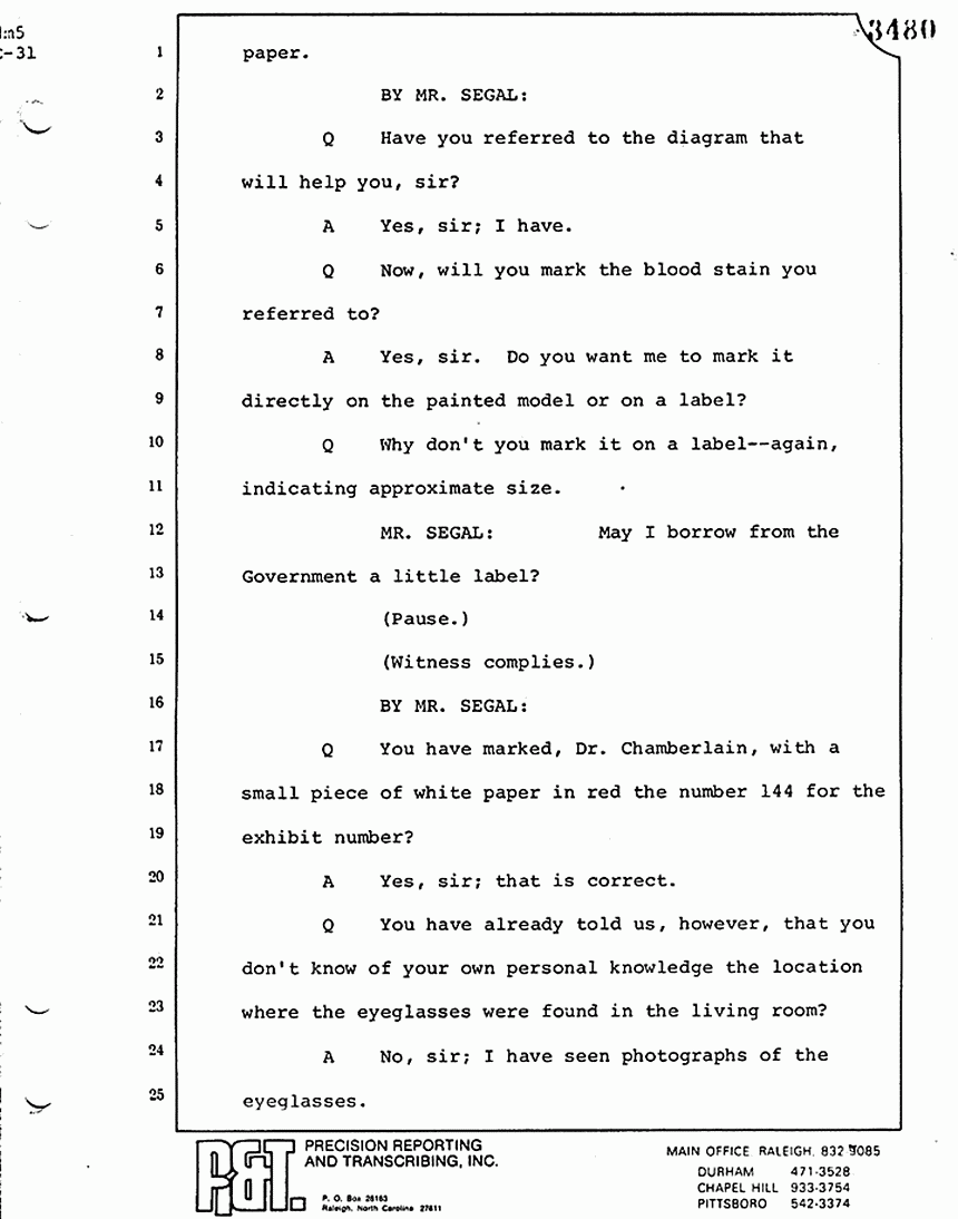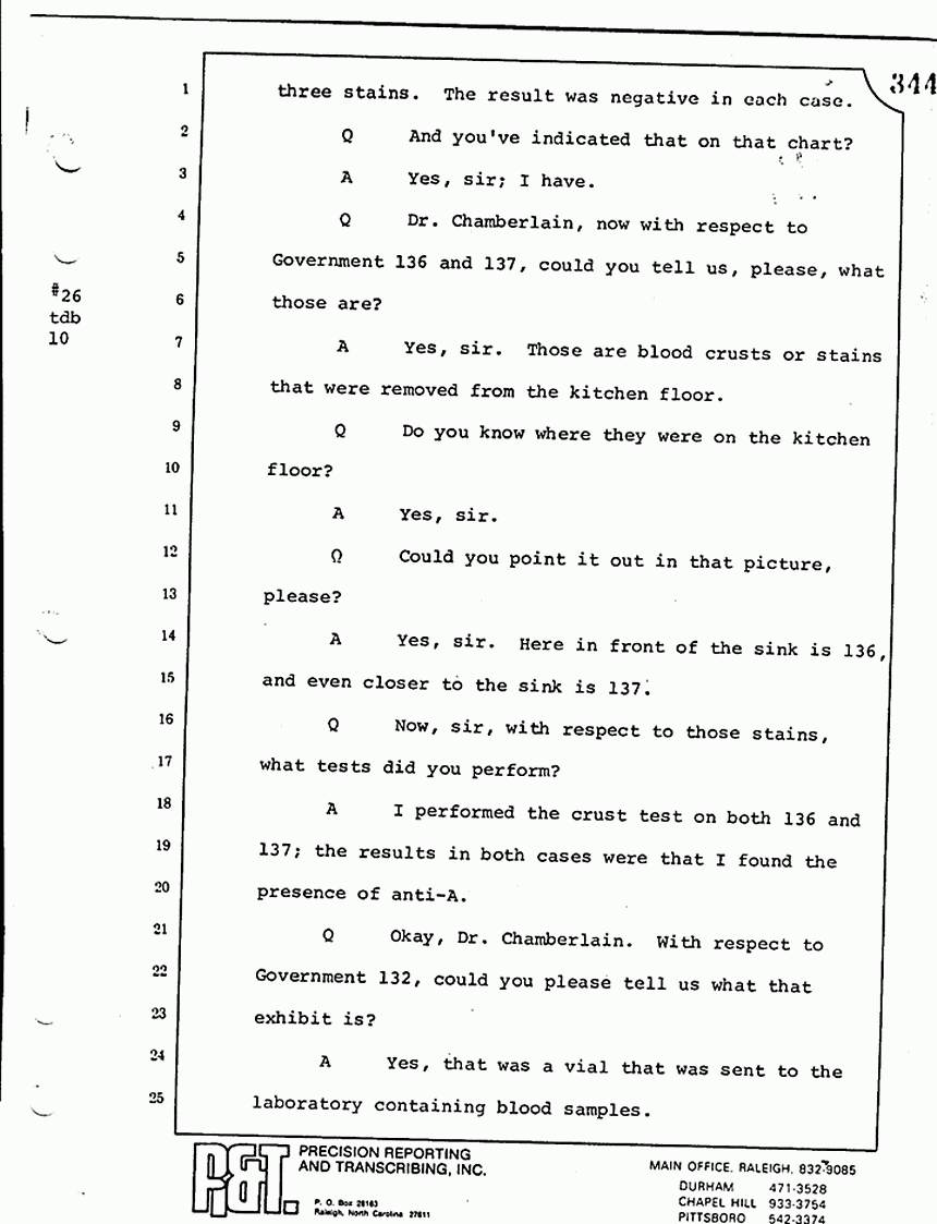 Q All right, let me ask a couple of other questions. Dr. Chamberlain, there are several hundred of these tests that you performed for dried blood stains, were there not, that you participated in performing tests?