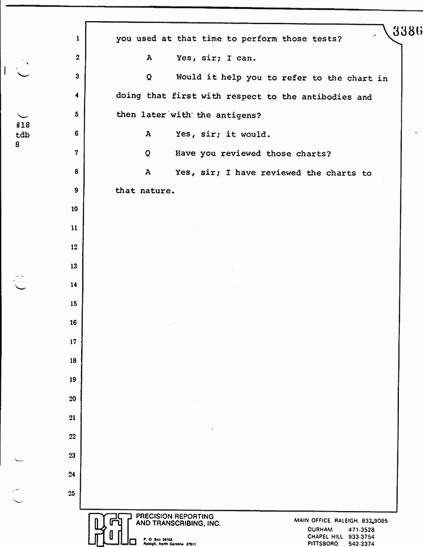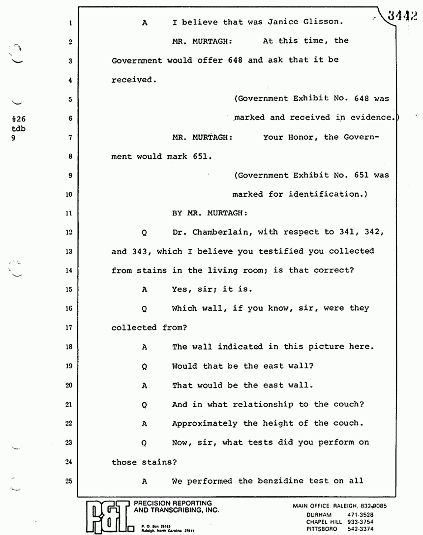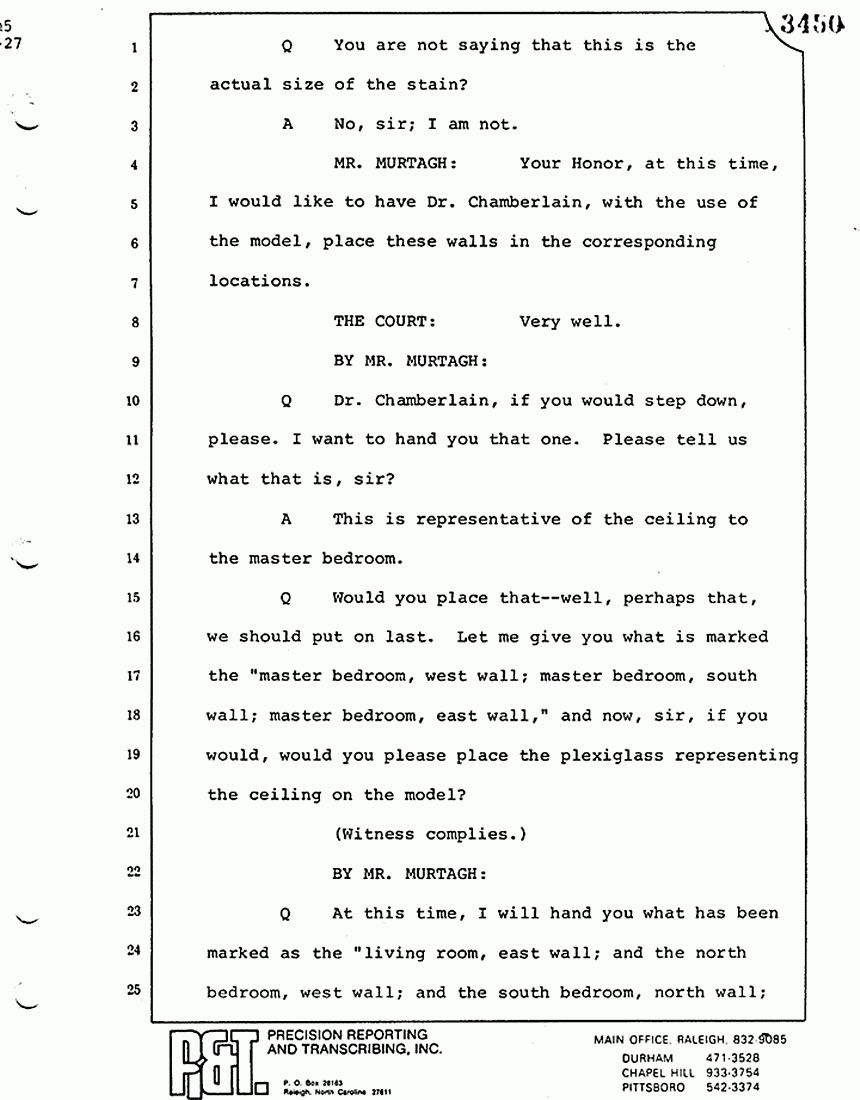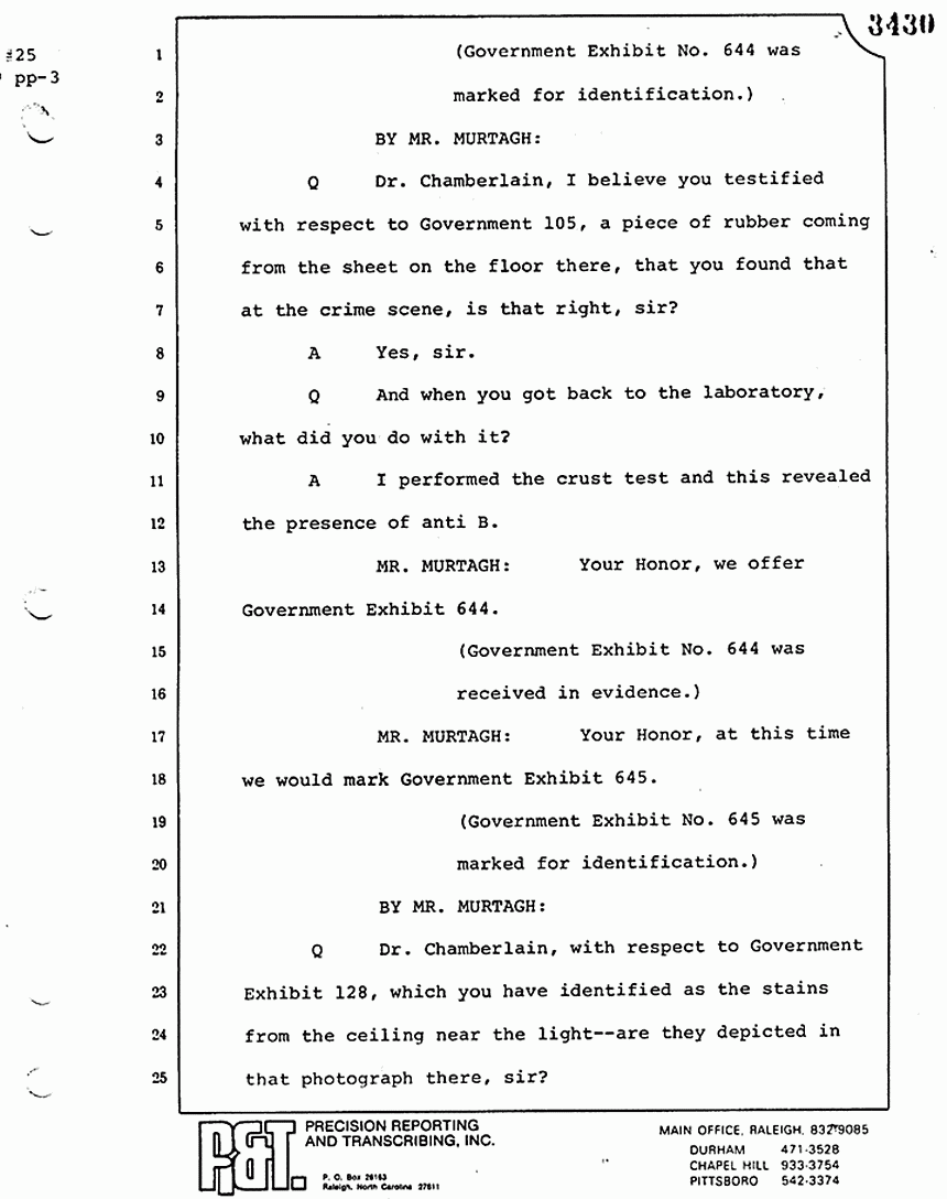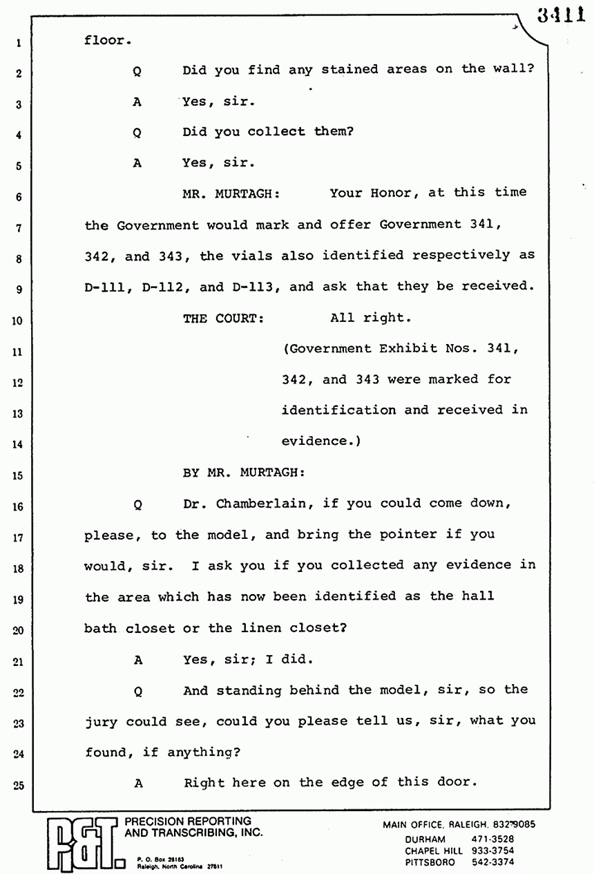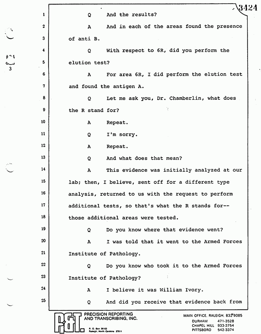 Q All right, let me ask a couple of other questions. Dr. Chamberlain, there are several hundred of these tests that you performed for dried blood stains, were there not, that you participated in performing tests?
