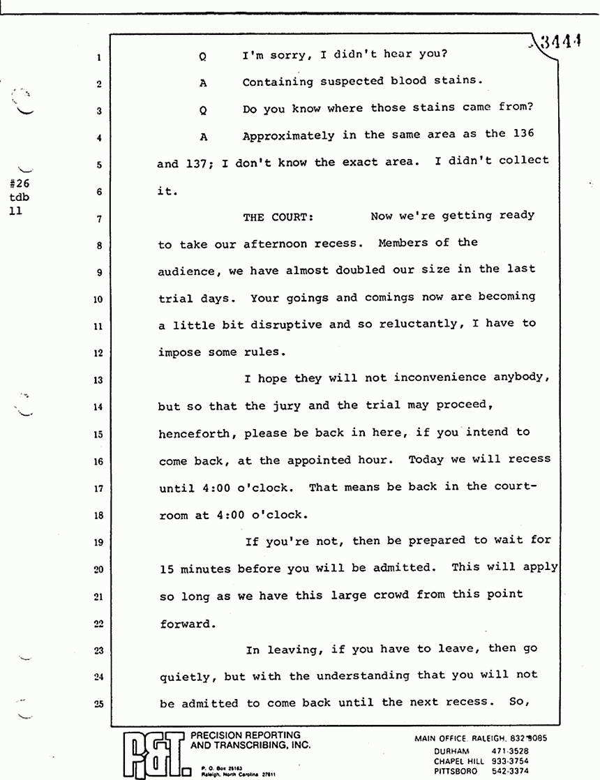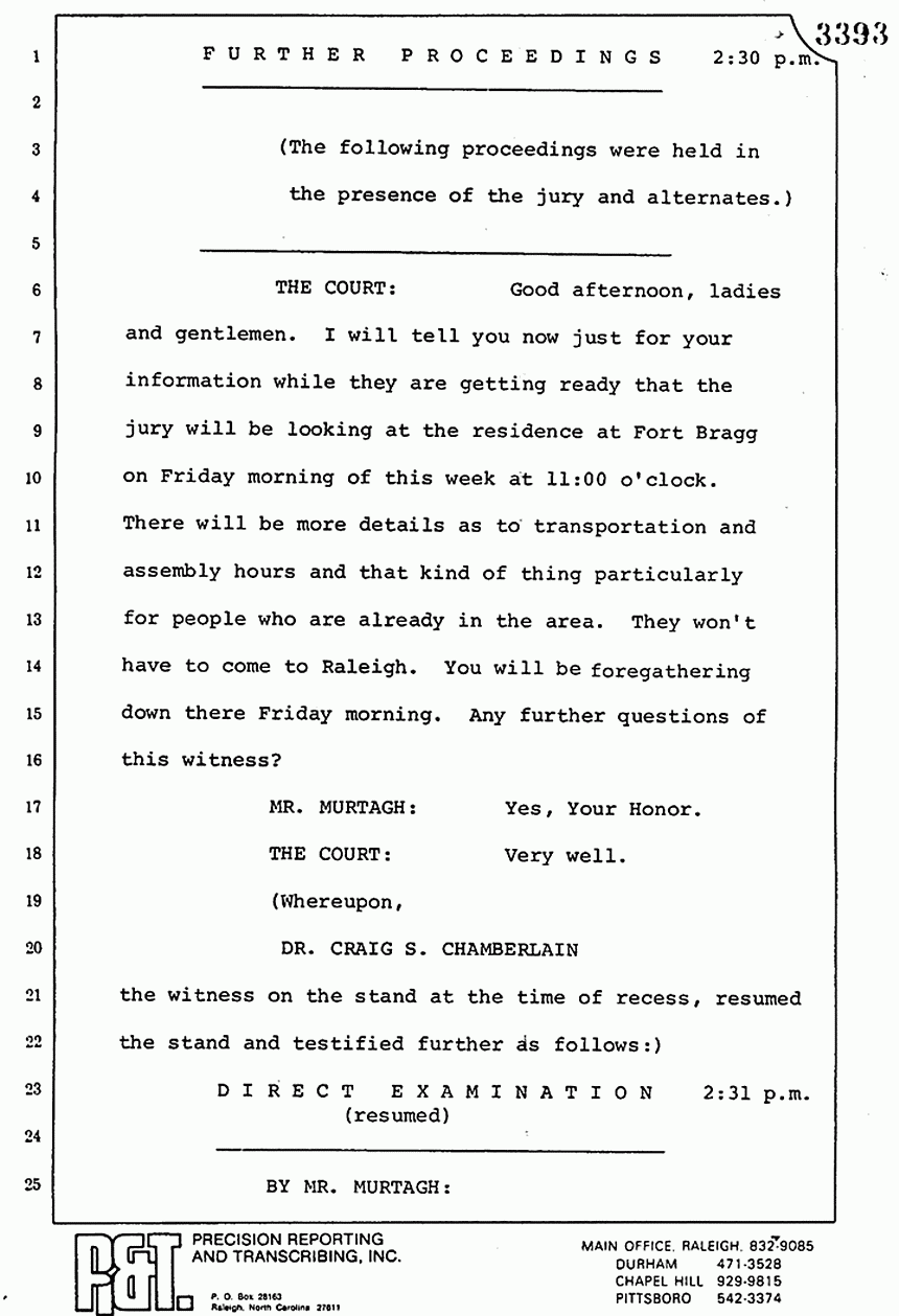 THE COURT: Very well, that brings us to the close of this day's trial day, members of the jury. We will take a recess now until 9:30 tomorrow morning. Remember all those things I told you to do. Don't talk about the case. Don't read or look at or listen to anything about it.