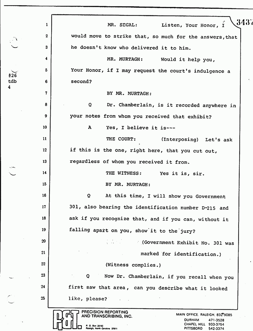 Q I noticed that when we had this exhibit here in court today -- we'll just talk about, if we may, 301. There are a couple of strips -- black strips -- nailed along the side; do you see that, Dr. Chamberlain?