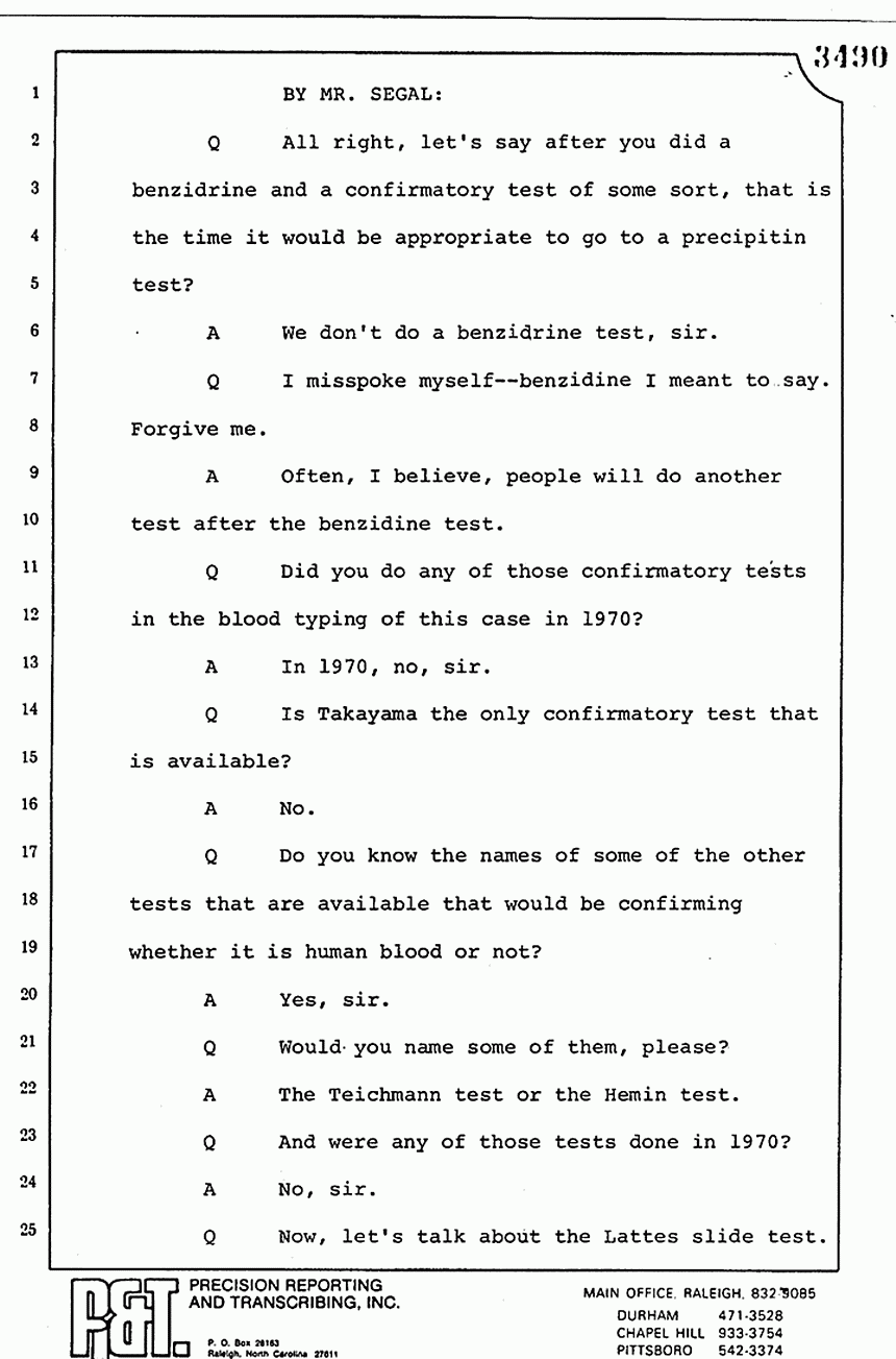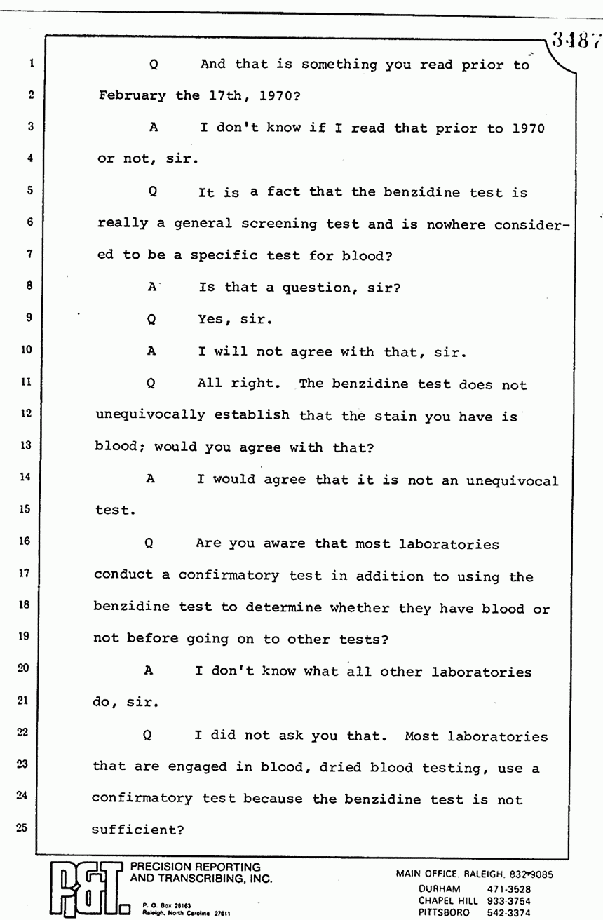 Q Yes. Don't you do a benzidine test first when you are doing dried blood typing? Don't you do a confirmatory test thereafter? Then if those two give you an indication of blood, that is the time you go, in most good laboratories, to the precipitin test?