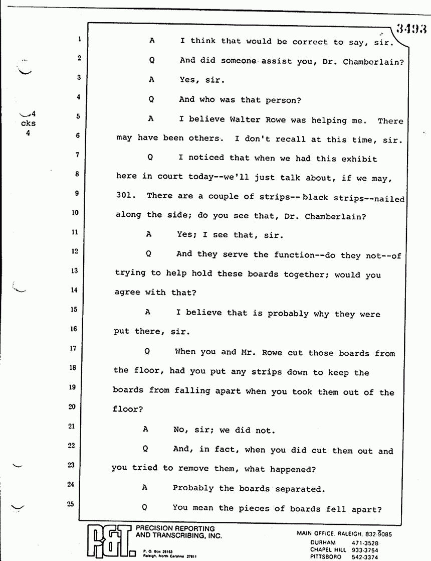 Q When you and Mr. Rowe cut those boards from the floor, had you put any strips down to keep the boards from falling apart when you took them out of the floor?