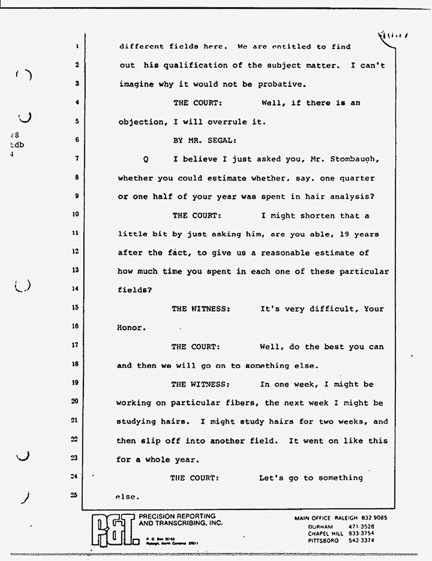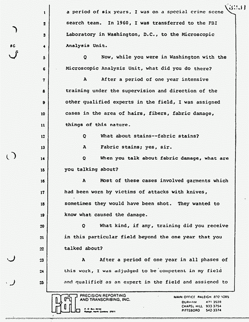 Q Now, in all these courts and states that you have testified, I take you to say that you have testified in the field of hair, fibers, fabric damage, and stains; is that correct?