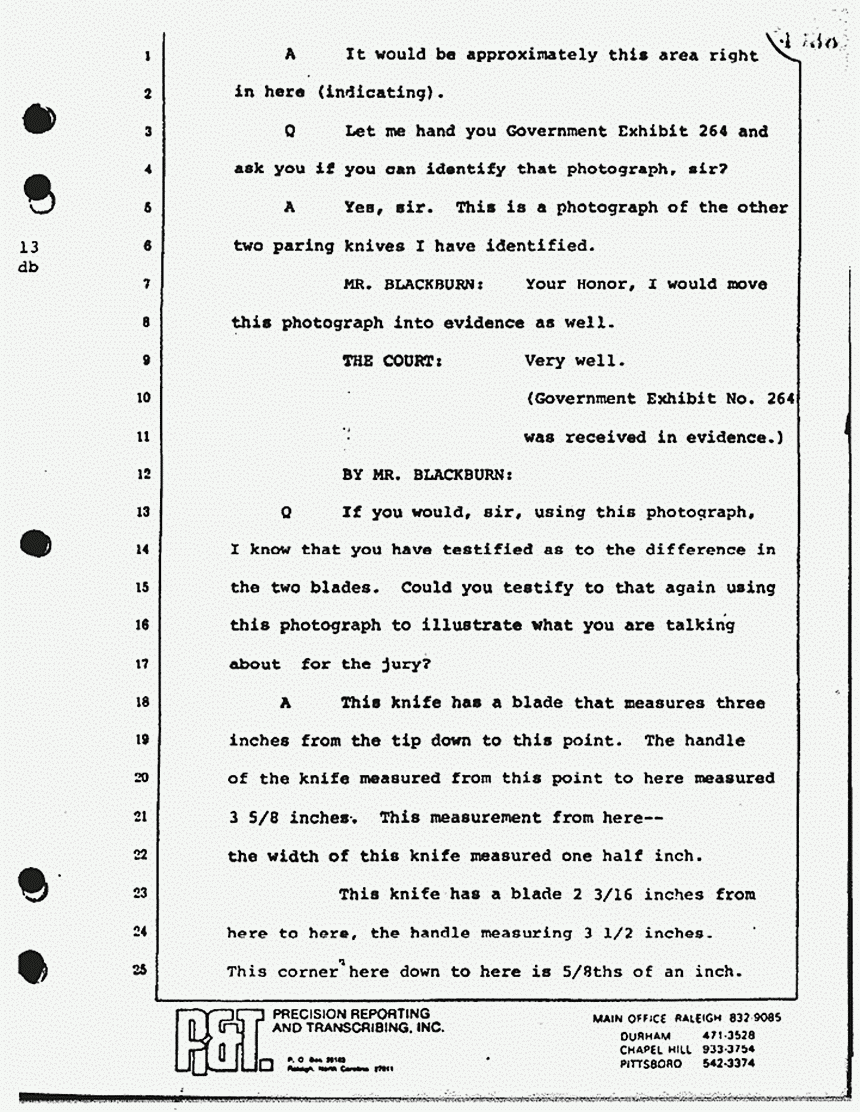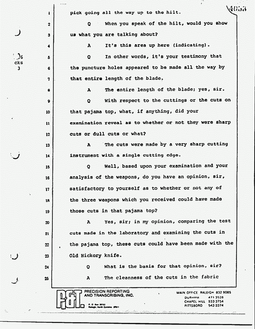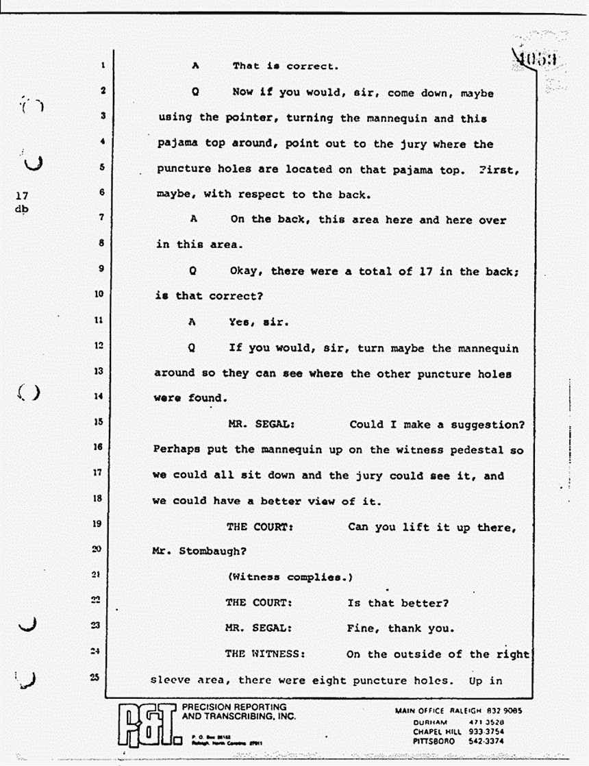 THE WITNESS: Had the garment been in motion when a sharp instrument was stuck into it, the holes would not be perfectly symmetrical like they are. There would be tearing of the yarns in the area from the force of the garment being moved.