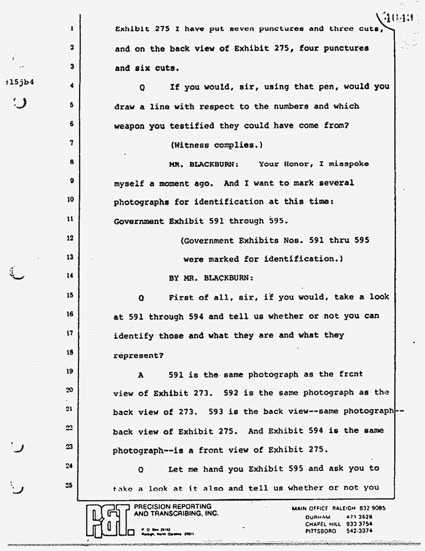 Q Mr. Stombaugh, if you would, sir, taking the black grease pen, fill in the appropriate blanks there, if you would, and draw lines after you have done so to the weapons that could have caused those cuts or punctures.