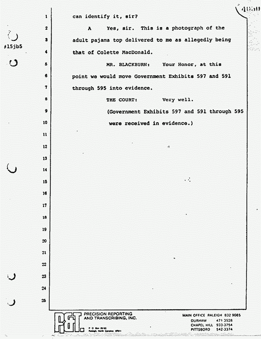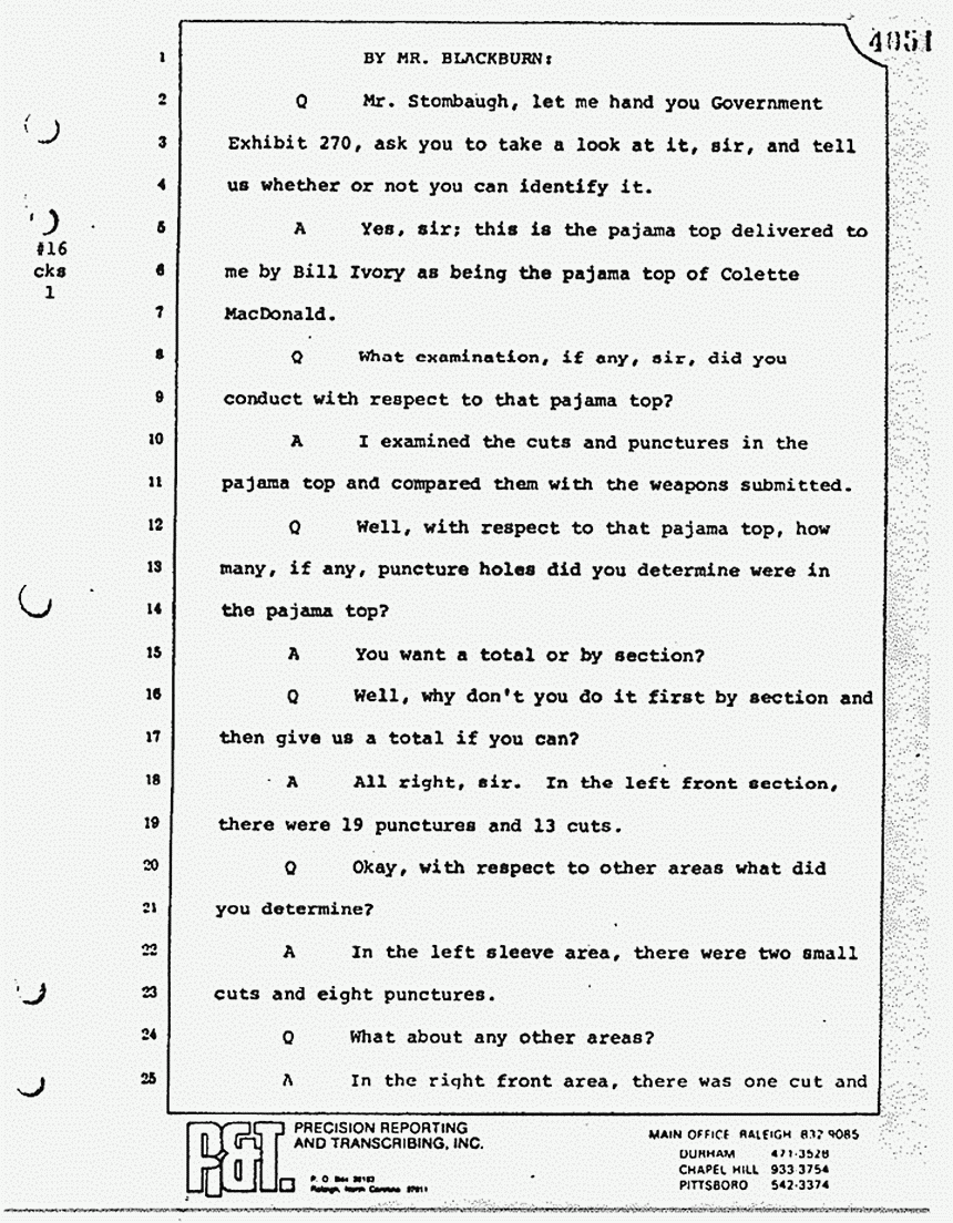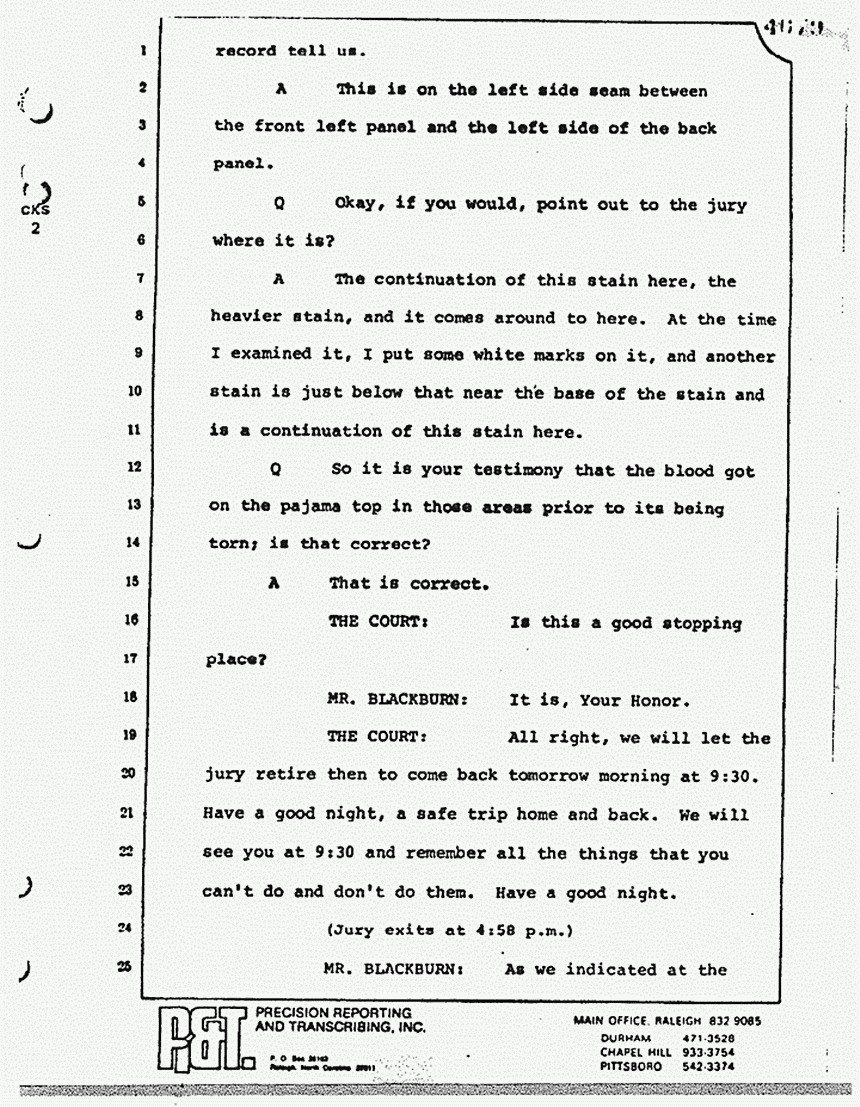Q Okay. Now, if you would, sir, maybe place it back up on the stand a little bit higher so everyone can see. Now, what examination, if any, did you conduct with respect to the bloodstained areas on that pajama top?