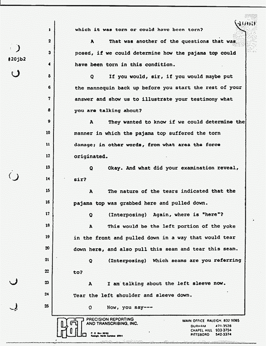 A That was another of the questions that was posed, if we could determine how the pajama top could have been torn in this condition.
