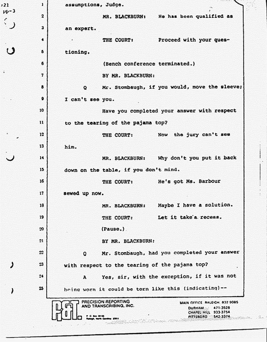 Q Mr. Stombaugh, if you would, move the sleeve; I can't see you. Have you completed your answer with respect to the tearing of the pajama top?