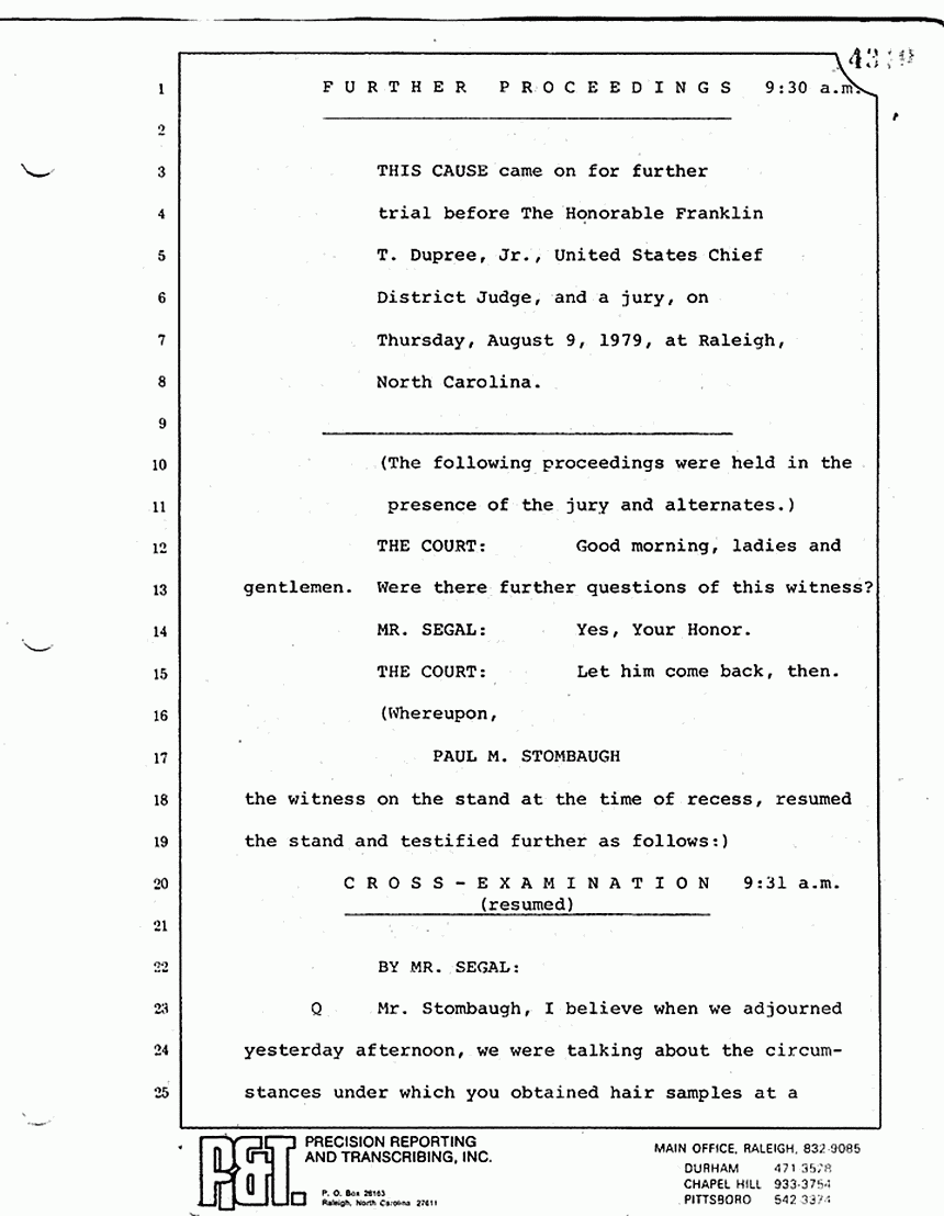 Q Mr. Stombaugh, I believe when we adjourned yesterday afternoon, we were talking about the circumstances under which you obtained hair samples at a cemetery in 1974. Do you recall that?
