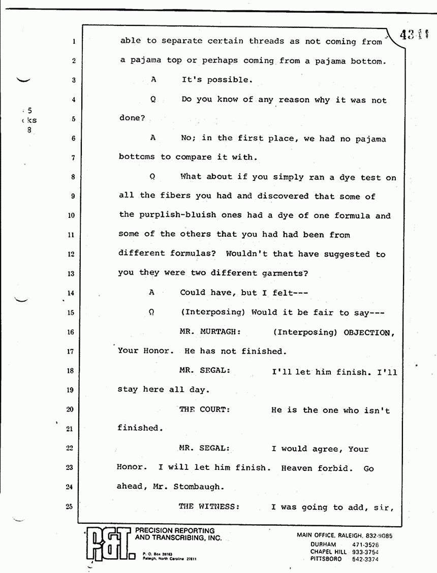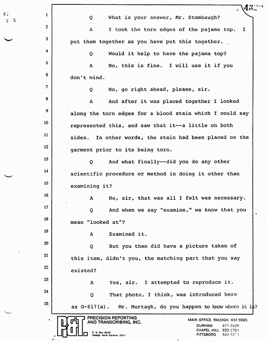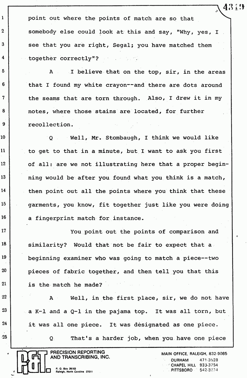 Q Well, I said, Mr. Stombaugh, first of all that I was suggesting to you only as an illustration that the process involved -- putting two pieces of fabric together and then you are going to want a photograph taken of it or a plastic overlay -- you would mark out the points of comparison so that my senior examiner, someone more experienced, could look at it see, "Yes, you've done a good job," or "No, you don't have a comparison." Isn't that the basic process that you have done here in looking at this pajama top? Now, we will get to the details of what you actually did. I want to know about the basic process. I think that is fair enough, Mr. Stombaugh, to ask you that?