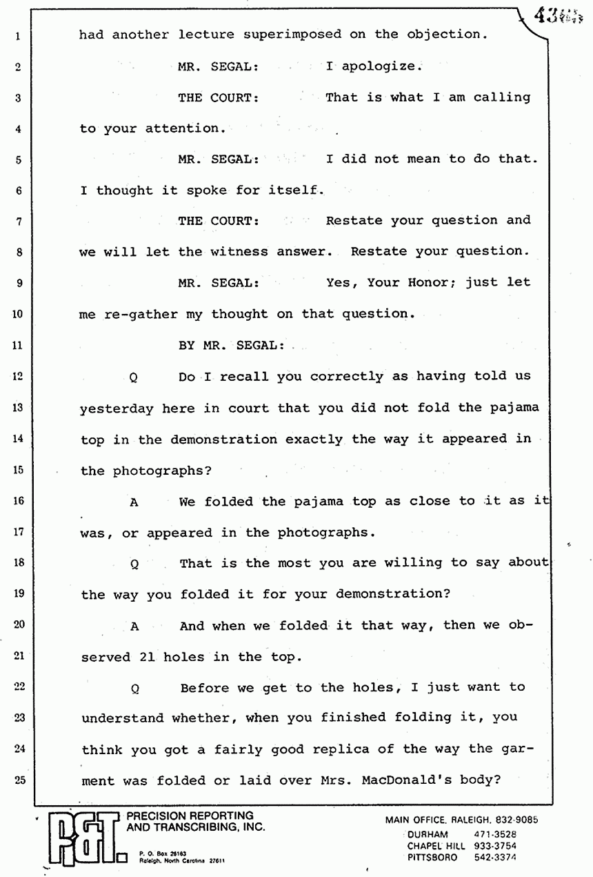 Q You were not willing to proceed using hairs that the CID had collected from what they thought were the MacDonald family clothing; is that correct?