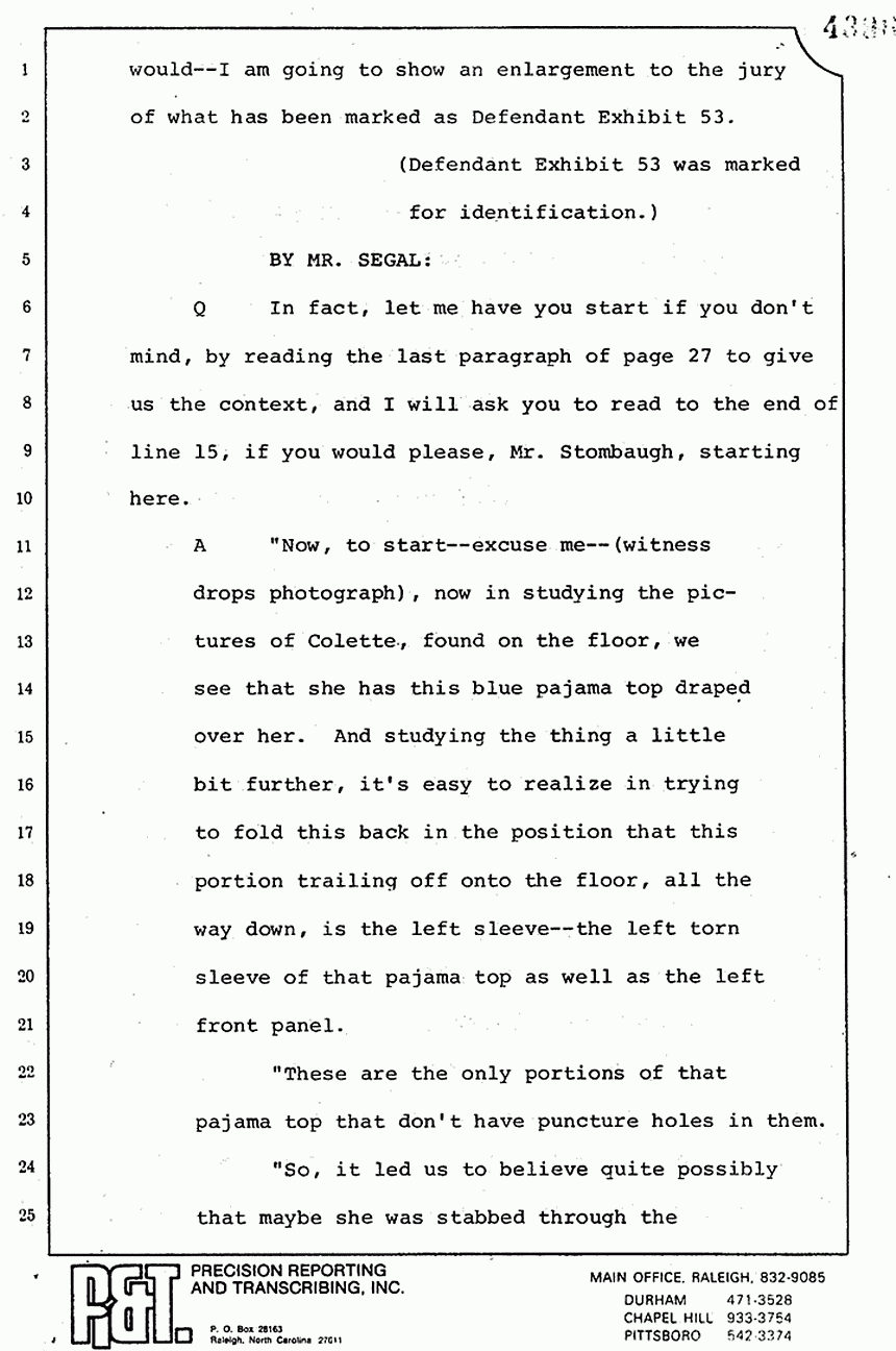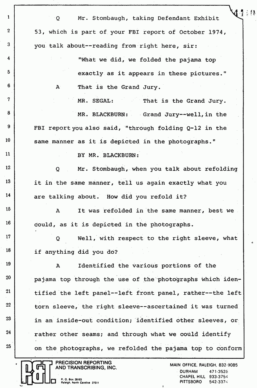 Q All right, let's talk about another matter, then, Mr. Stombaugh. Yesterday you told us about a comparison you made about the pajama top. I believe you told us -- and it was actually on Tuesday, not yesterday -- that the CID wanted you to answer the following question: whether or not the pajama top -- the blue pajama top, in this case -- was torn before or after blood stains were placed on it. Do you recall that you testified when that question was put to you?