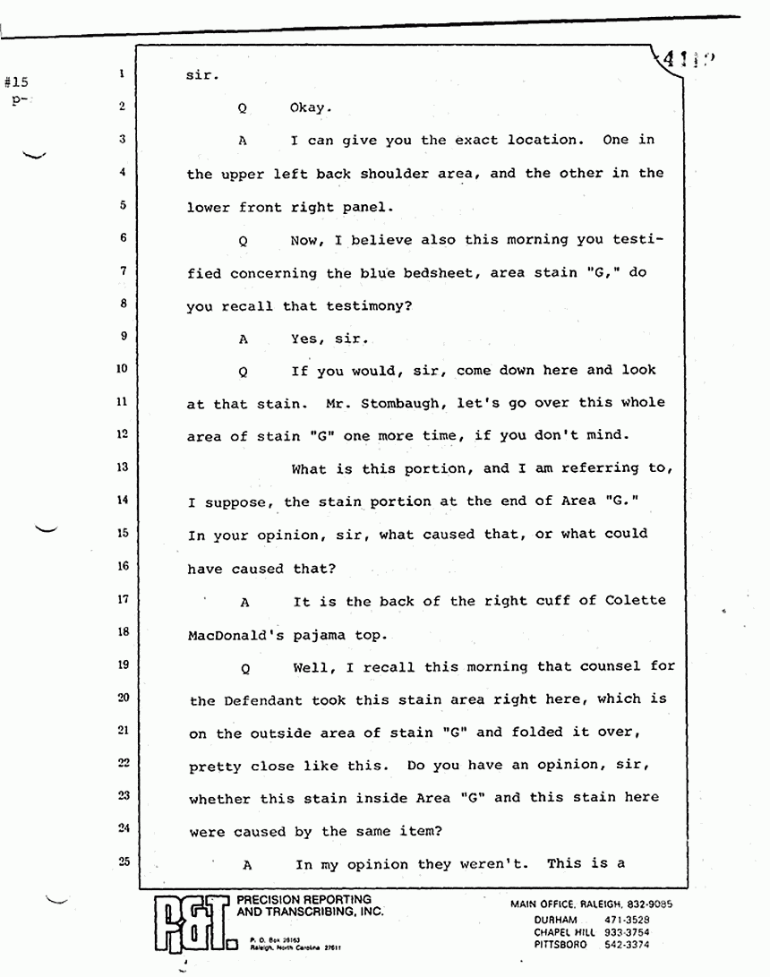Q Now, I believe also this morning you testified concerning the blue bedsheet, area stain "G," do you recall that testimony?
