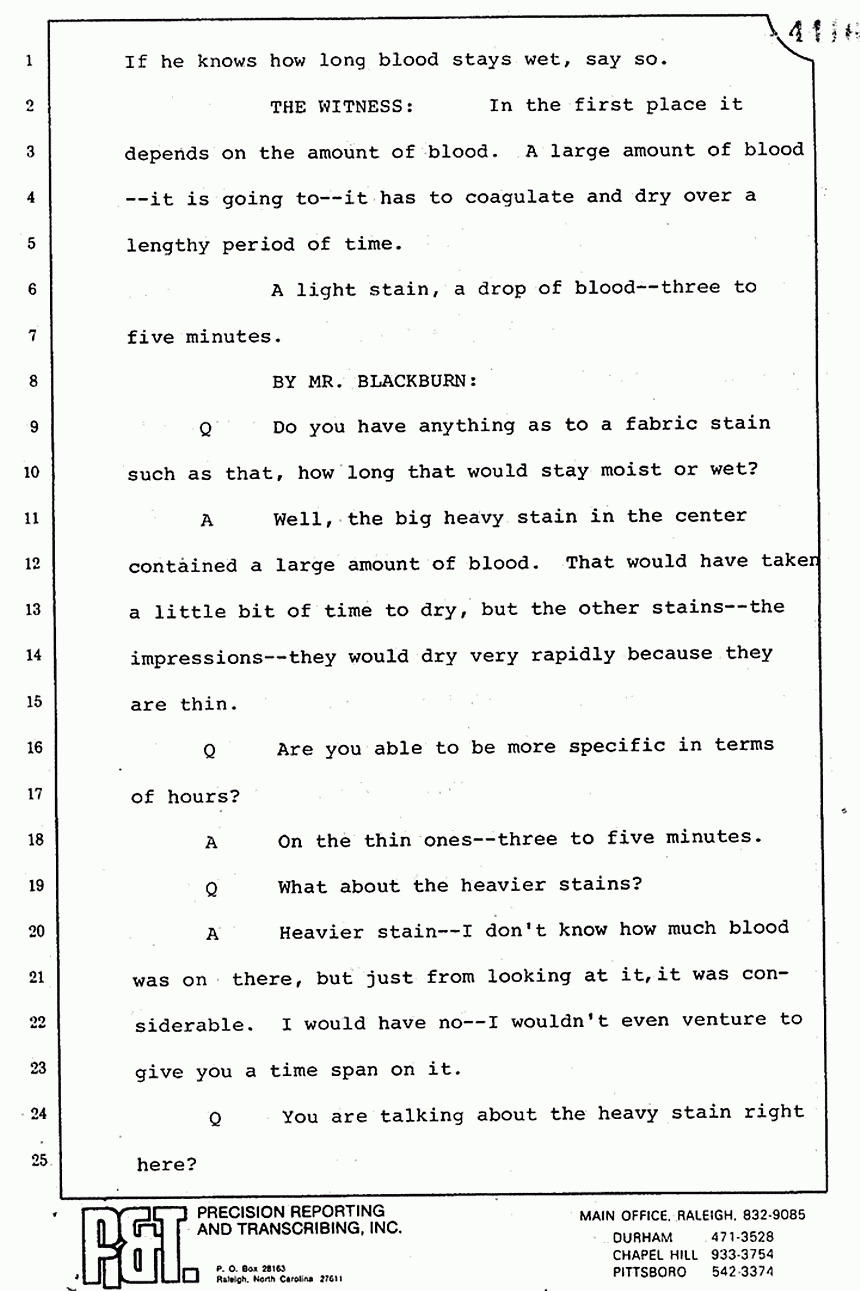 THE COURT: I think he has already given us that, too. I will OVERRULE the objection. If he knows how long blood stays wet, say so.