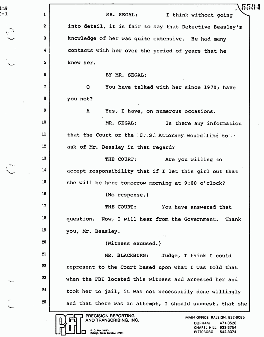 MR. BLACKBURN: Judge, I think I could represent to the Court based upon what I was told that when the FBI located this witness and arrested her and took her to jail, it was not necessarily done willingly and that there was an attempt, I should suggest, that she did not want to come here -- including, I might say, hiding out in the physical structure in which she was supposed to be residing. Taking that into account with the fact that Mr. Beasley -- of course, whom I have never met before and don't mean to imply anything by this -- is, as I understand it, a potential witness for the Defendant. Based on what this witness might or might not say or have said in the past, that at the very least, we would appreciate a deferral of your ruling until after we have talked with the witness. I think the Government is concerned that so much trouble was spent in locating her and bringing her in the first place. We are very skeptical of releasing her at this time.