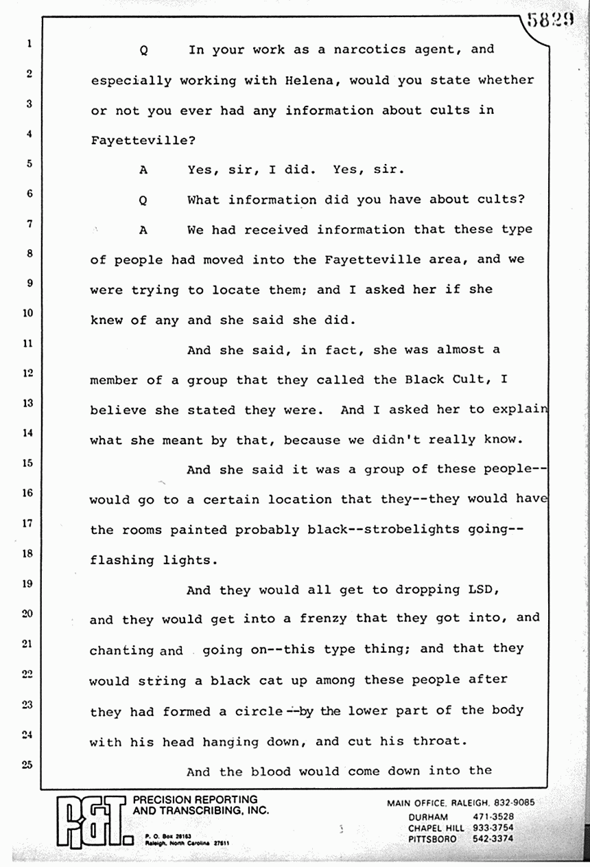 A We had received information that these type of people had moved into the Fayetteville area, and we were trying to locate them; and I asked her if she knew of any and she said she did. And she said, in fact, she was almost a member of a group that they called the Black Cult, I believe she stated they were. And I asked her to explain what she meant by that, because we didn't really know. And she said it was a group of these people -- would go to a certain location that they -- they would have the rooms painted probably black -- strobelights going -- flashing lights. And they would all get to dropping LSD, and they would get into a frenzy that they got into, and chanting and going on -- this type thing; and that they would string a black cat up among these people after they had formed a circle -- by the lower part of the body with his head hanging down, and cut his throat. And the blood would come down into the floor and they'd get in the blood and rub it on them -- all over them -- and that type of thing.