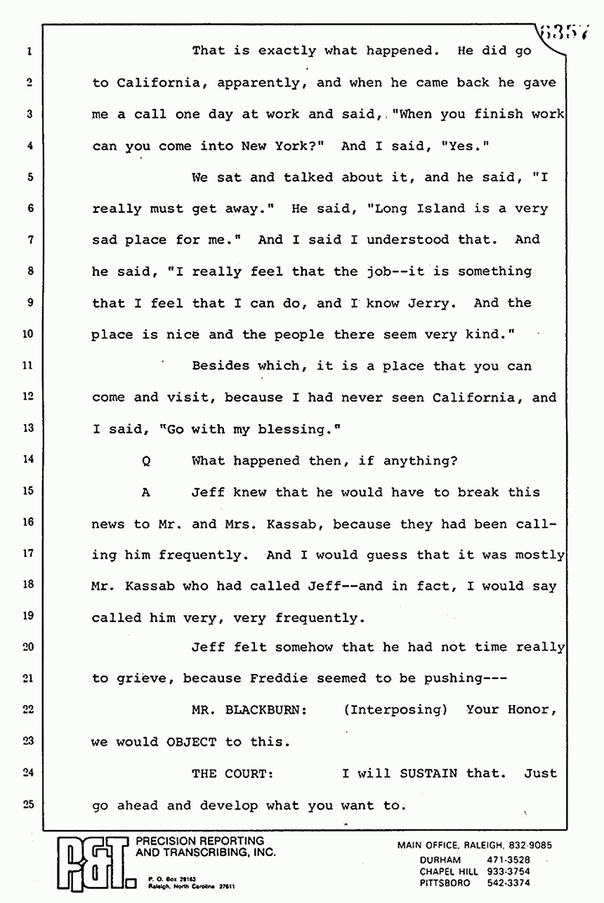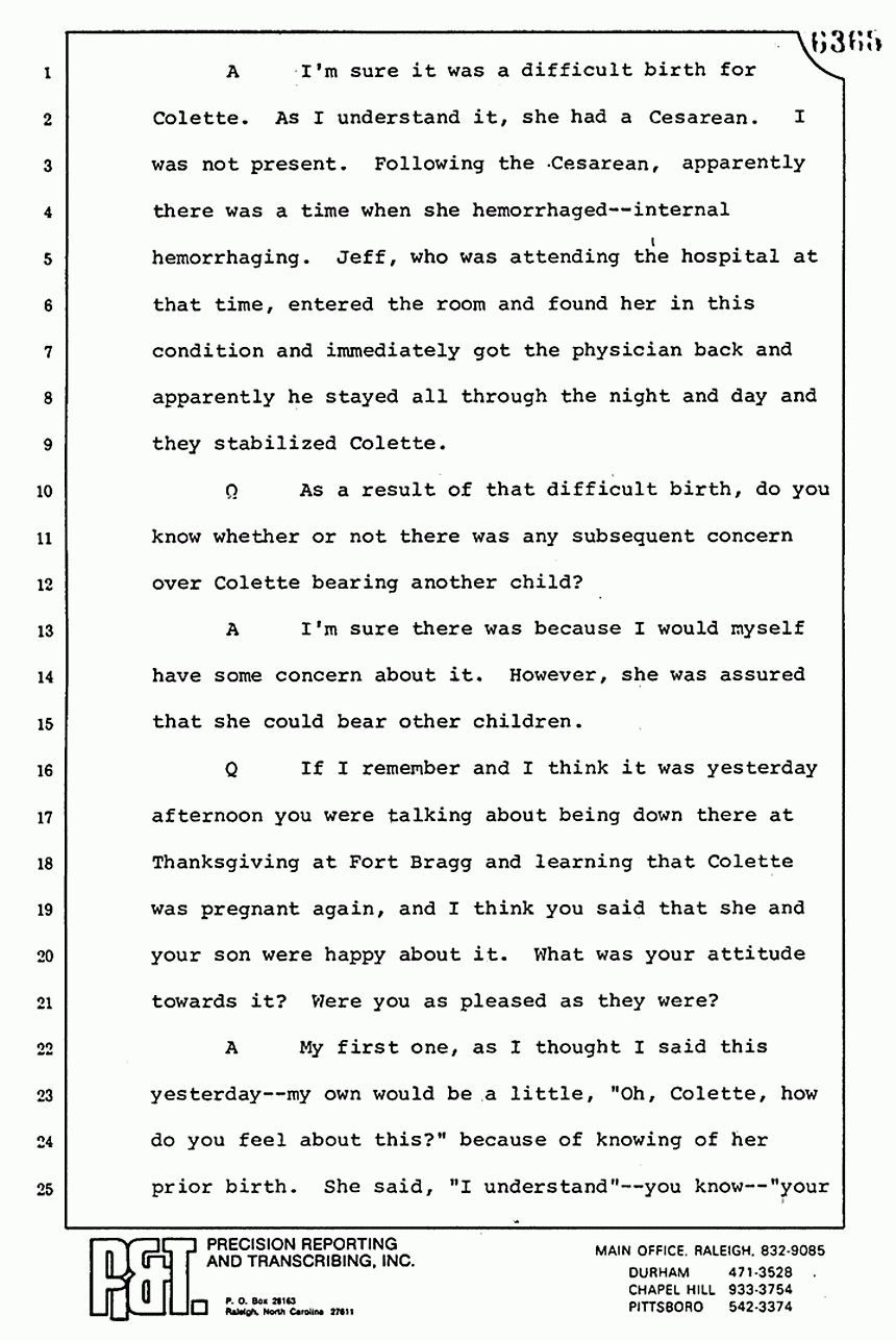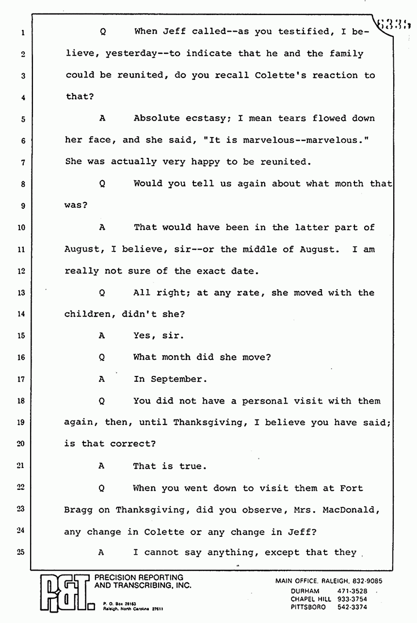 Q Mrs. MacDonald, I believe when we stopped for the day yesterday, I had asked you a question about the time that Colette came to live with you in Patchogue after your son had gone to Fort Bragg to serve in the military, so let's begin there. How long did Colette remain with you in Patchogue after Jeff had gone into the military?