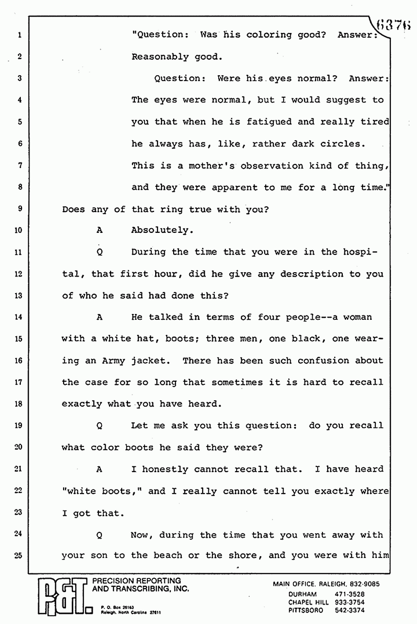 Q Let me read from page 48 of your grand jury testimony -- just a couple of lines -- and ask you whether or not this rings a bell with you. Starting on the last line on page 47: "...Question: As a nurse, what was your observation as to his physical condition? Answer: Well, I would say that he -- Question: Was his coloring good? Answer: Reasonably good. Question: Were his eyes normal? Answer: The eyes were normal, but I would suggest to you that when he is fatigued and really tired he always has, like, rather dark circles. This is a mother's observation kind of thing, and they were apparent to me for a long time." Does any of that ring true with you?