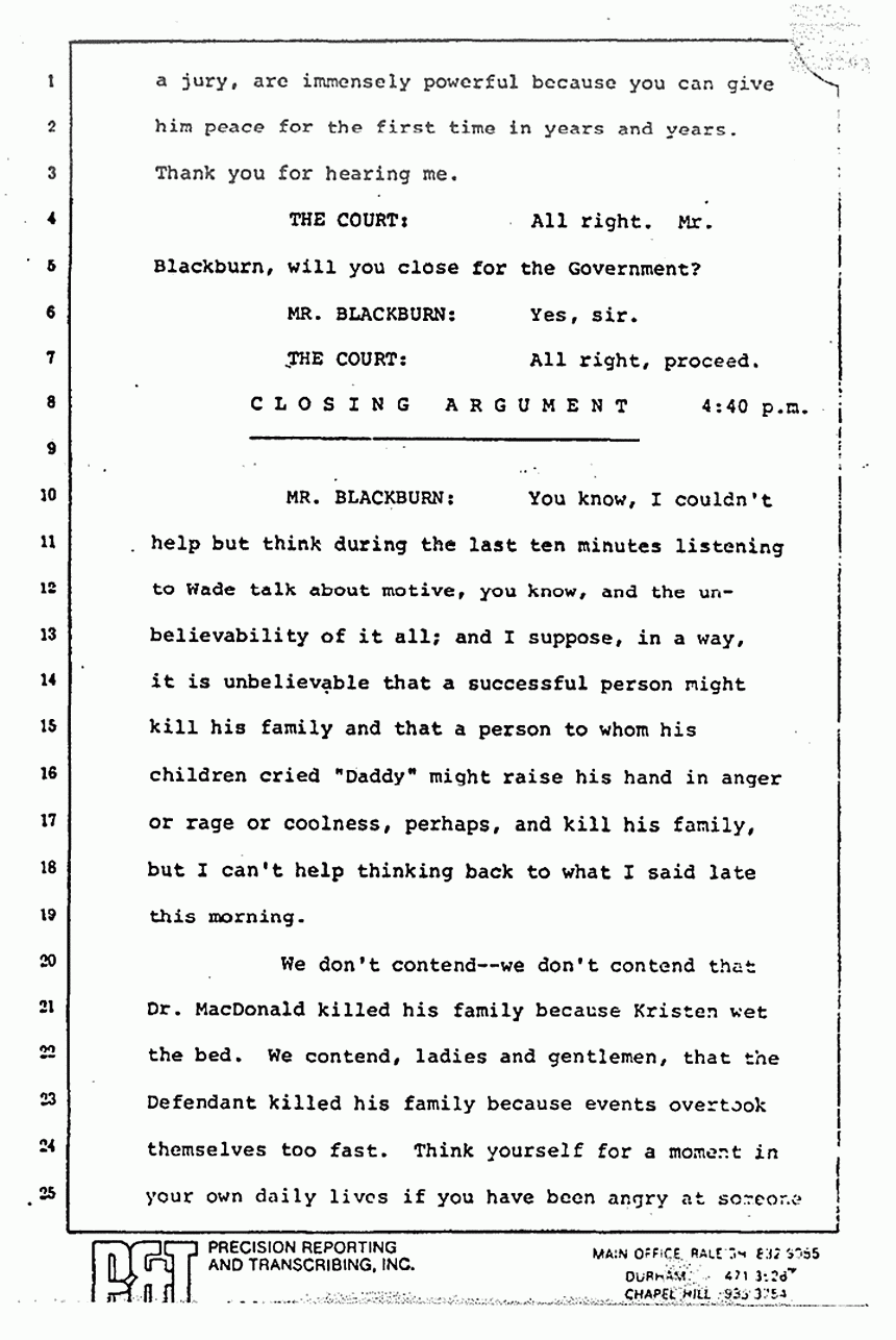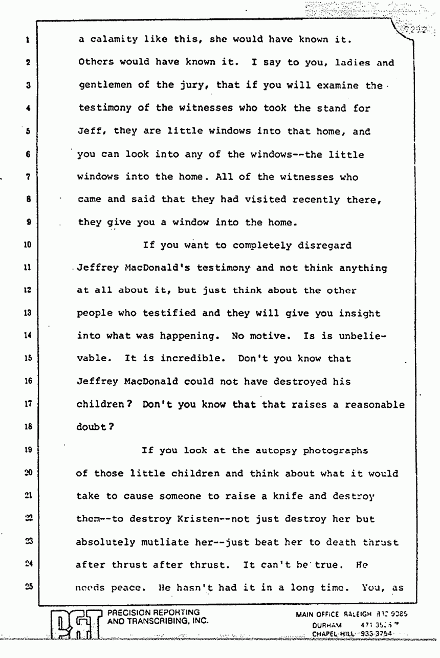 If you want to completely disregard Jeffrey MacDonald's testimony and not think anything at all about it, but just think about the other people who testified and they will give you insight into what was happening. No motive. It is unbelievable. It is incredible. Don't you know that Jeffrey MacDonald could not have destroyed his children? Don't you know that that raises a reasonable doubt?