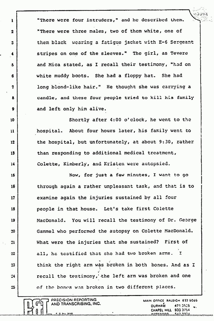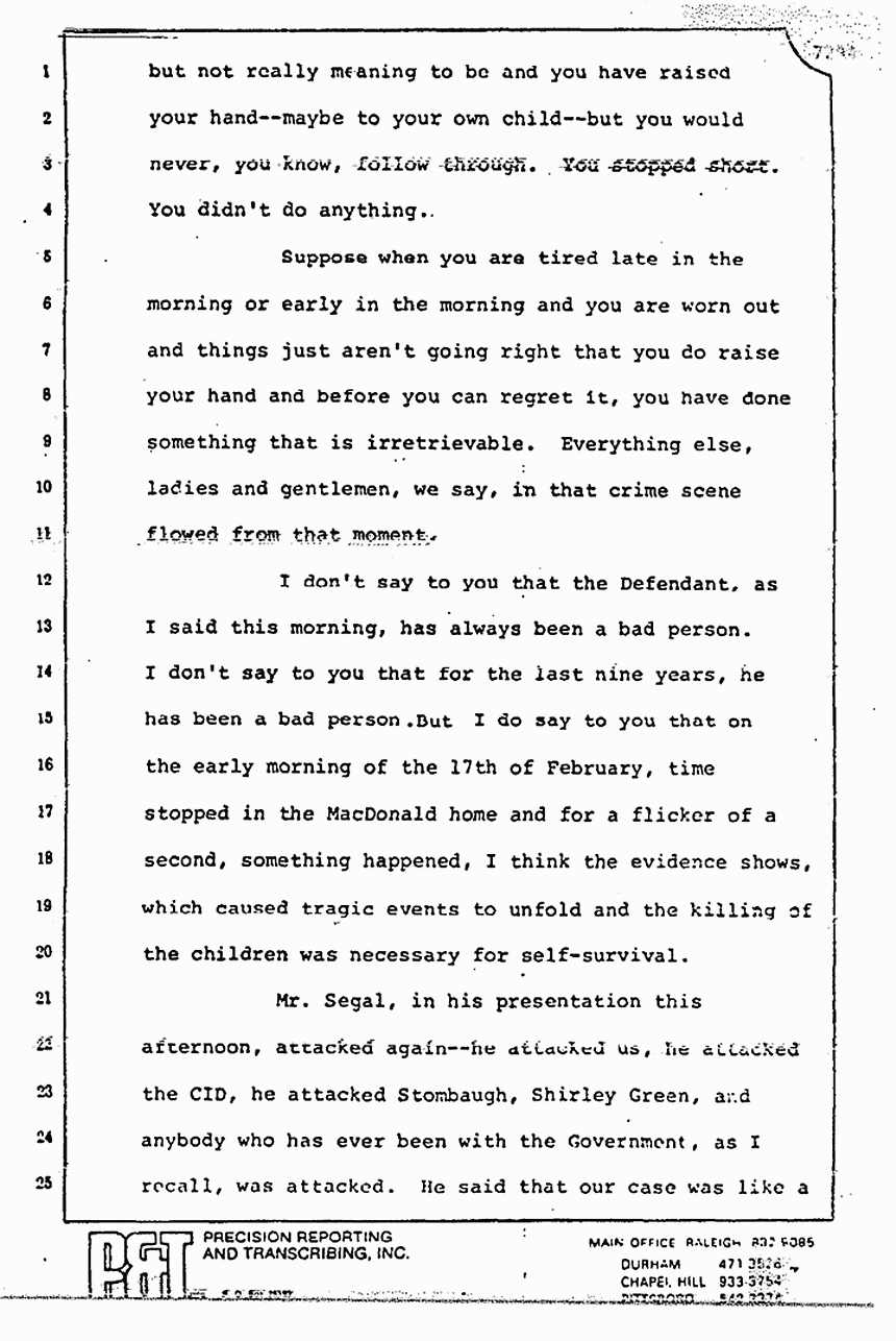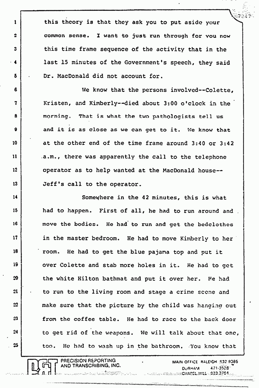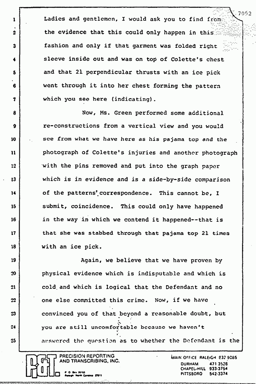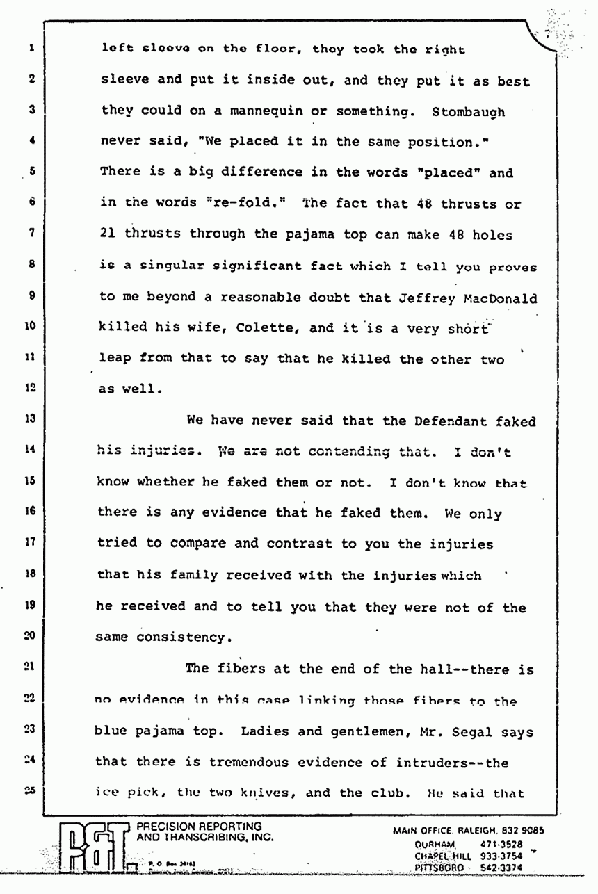 They read you part of Stombaugh's testimony and tried to imply that he changed his story. Huh-uh. You remember what he said? He said, "We re-folded it exactly the same way," and they did. They put the left sleeve on the floor, they took the right sleeve and put it inside out, and they put it as best they could on a mannequin or something. Stombaugh never said, "We placed it in the same position." There is a big difference in the words "placed" and in the words "re-fold." The fact that 48 thrusts or 21 thrusts through the pajama top can make 48 holes is a singular significant fact which I tell you proves to me beyond a reasonable doubt that Jeffrey MacDonald killed his wife, Colette, and it is a very short leap from that to say that he killed the other two as well.