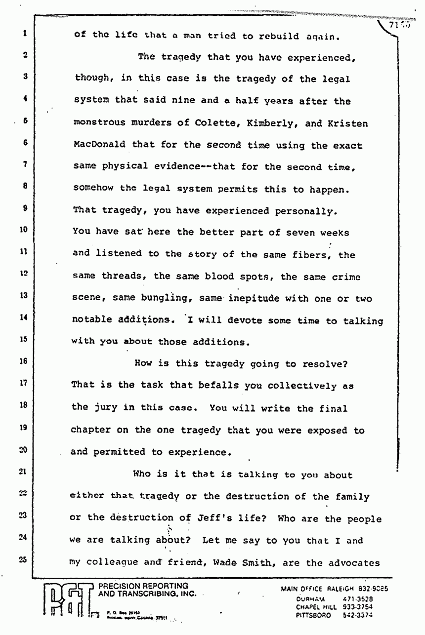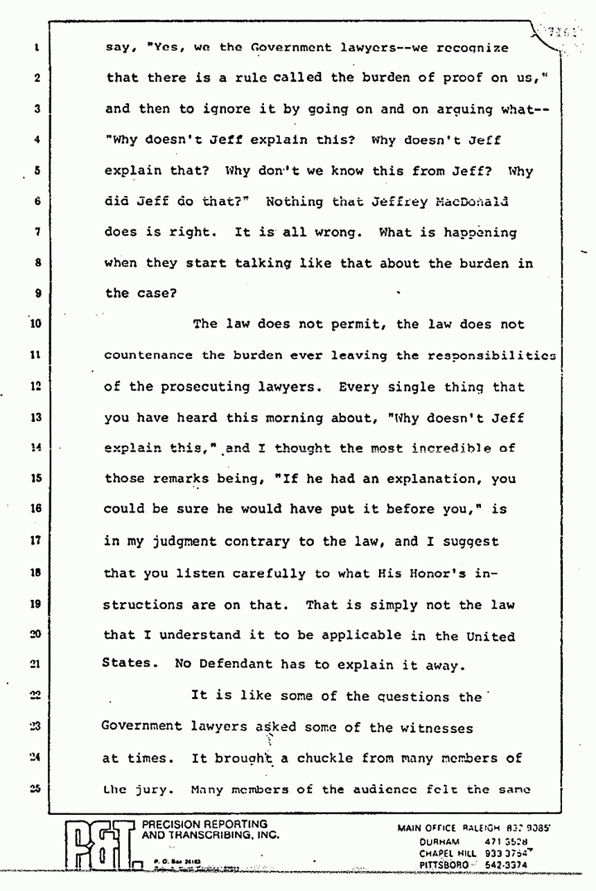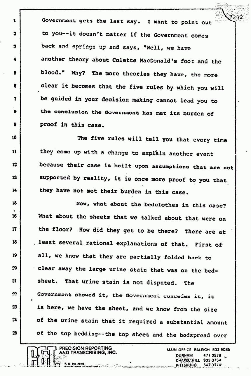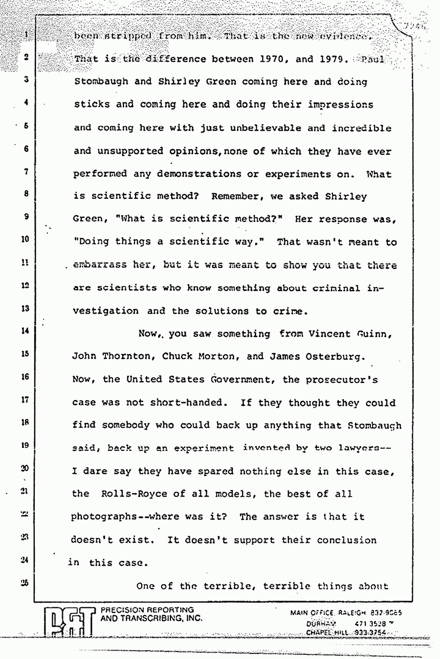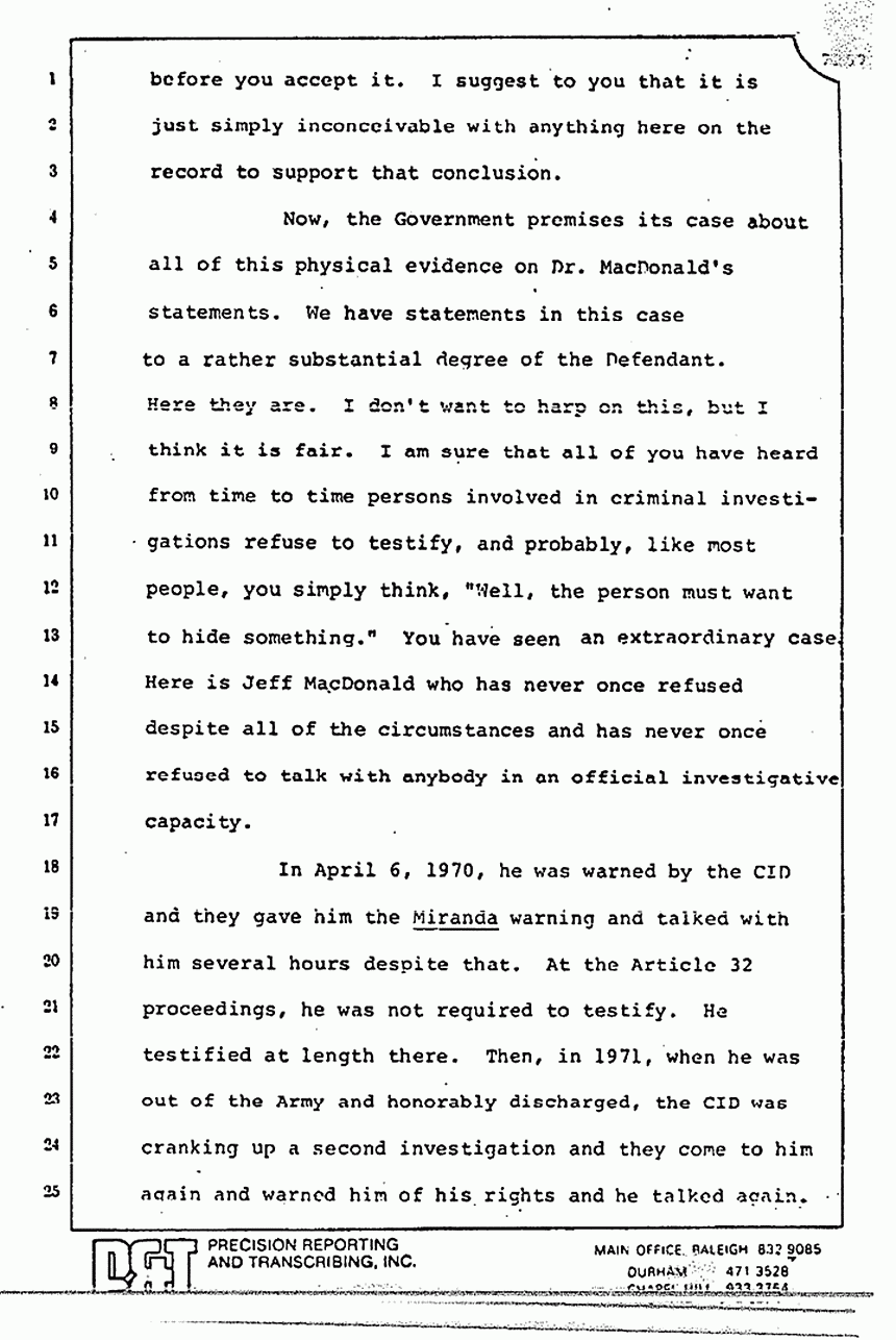 They read you part of Stombaugh's testimony and tried to imply that he changed his story. Huh-uh. You remember what he said? He said, "We re-folded it exactly the same way," and they did. They put the left sleeve on the floor, they took the right sleeve and put it inside out, and they put it as best they could on a mannequin or something. Stombaugh never said, "We placed it in the same position." There is a big difference in the words "placed" and in the words "re-fold." The fact that 48 thrusts or 21 thrusts through the pajama top can make 48 holes is a singular significant fact which I tell you proves to me beyond a reasonable doubt that Jeffrey MacDonald killed his wife, Colette, and it is a very short leap from that to say that he killed the other two as well.