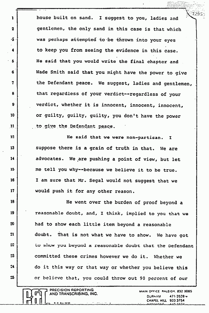 Mr. Segal, in his presentation this afternoon, attacked again -- he attacked us, he attacked the CID, he attacked Stombaugh, Shirley Green, and anybody who has ever been with the Government, as I recall, was attacked. He said that our case was like a house built on sand. I suggest to you, ladies and gentlemen, the only sand in this case is that which was perhaps attempted to be thrown into your eyes to keep you from seeing the evidence in this case. He said that you would write the final chapter and Wade Smith said that you might have the power to give the Defendant peace. We suggest, ladies and gentlemen, that regardless of your verdict -- regardless of your verdict, whether it is innocent, innocent, innocent, or guilty, guilty, guilty, you don't have the power to give the Defendant peace.